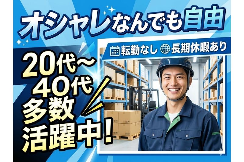 アピールポイント: ✦✧ 現在、働き方改革を実施中✧✦ より良い労働環境を目指して 働きやすさを重視した 職場づくりを推進中(^^)★ 現場の声をしっかり反映しながら 制度の充実を図っています! ✅正社員登用前提の募集 * 正社員登用後の給与は月収295,000円〜✨ * キャリアアップしたい方も大歓迎♪ ✅資格取得支援制度あり * 会社全額負担で資格GET(^^)★ * フォークリフトの免許が取れます◎ ✅オシャレの自由度高め * 髪型・ピアス・ネイル・ヒゲ自由! * あなたらしいスタイルのままでOK――☆ ✅無資格・未経験大歓迎 * これまでの経験・知識不問✨ * 研修制度でフォローアップします♪ ✦✧ 在籍スタッフの声✧✦ 「正直、ここまで稼げるとは思っていませんでした!」 (入社1年目/20代男性) 私は全くの未経験で、貯金もスキルもゼロからのスタートでした。アルバイトから始めましたが、最初はピッキングから丁寧に教えてもらえたので不安はなかったです。 入社後すぐに会社の全額負担でリフト免許を取らせてもらえたのが転機でしたね。できることが増えるとどんどん楽しくなって、半年後には正社員に。 今は月収29.5万円以上しっかりいただけているので、生活も安定しました。 次はもっと現場を回せるリーダーを目指して頑張っています! 「『働き方改革』を肌で感じる、風通しの良い職場です」 (入社2年目/30代男性) 以前も物流関係で働いていましたが、ここは本当にスタッフの声を拾ってくれる会社です。「もっとこうしたら作業しやすい」という意見を気軽に言える雰囲気があったので、アルバイト時代から疎外感なく働けました。 正社員になってからは、より責任のある仕事も任せてもらっていますが、空調完備の快適な環境なので体力的にも無理なく続けられています。 新しい事業所もどんどん増えており、成長している会社で腰を据えて働ける安心感がありますね。髪型やひげも自由なので、自分らしく働けるのが気に入っています。