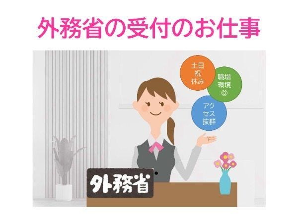 PRコメント 【仕事内容】 。*:゜☆*☆゜:。*。 外務省の受付のお仕事 女性更衣室・女性専用休憩室完備♪ 女性が多く活躍している現場です♡ 各路線からのアクセス抜群 *・゚゚・*:.。..。.:*・*:.。. .。.:*・゚゚・* \安心・人気の受付窓口/ お任せしたいのは受付やご案内のシンプルなお仕事です。 特別な知識・経験がない方も丁寧な研修をご用意しているので、ご安心ください。 30代・40代・50代からスタッフデビューした方も多数在籍中! 日常英会話できる方優遇!! 語学手当1,500円/1勤務 \"受付窓口の経験がない方"も活躍中/ ■知識・経験がない方も丁寧な研修を用意しておりますのでご安心ください。 ■30代・40代・50代からのスタッフデビューも活躍中! ★弊社は様々な前職から転職をした方々が活躍をしている企業です。 ★豊富なノウハウであなたのデビューをサポート致します! \働きやすい環境♪/ ■シフト制で休みの予定が立てやすい♪ ■室内なので年中快適♪ ★こまめな休憩があることも長く続けやすいポイント! ★お仕事も一度覚えてしまえば簡単です。 ★体への負担が少ないからこそ、どなたにも始めやすい・続けやすい。 \充実の手当あり♪/ ■賞与年2回(20万円以上も可!) ★未経験でもしっかり稼げます \どれくらい稼げる…?/ <モデルケース> 在籍期間:1年以上 勤務実績:週4勤務以上 ボーナス:10万円(×年2回) 週5回・「09:00~18:00」勤務の場合 日給10000円+(語学手当1500円)×月21日 =月収24万1500円 =年収309万8000円(ボーナス含む)