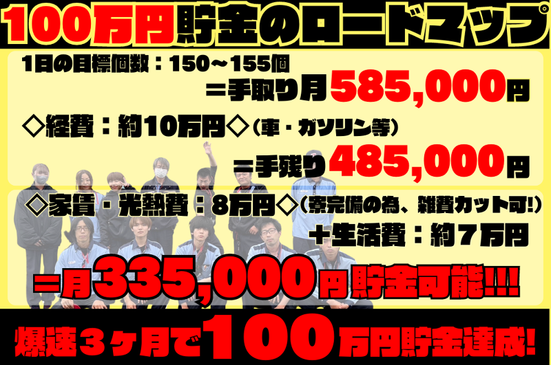 アピールポイント: ✨✨✨✨✨✨✨✨✨✨✨✨✨✨✨✨ ⭐️ ? 最 速 で 1 0 0 万 円 貯 め る に は ? ⭐️ ✨✨✨✨✨✨✨✨✨✨✨✨✨✨✨✨ 【 1日の目標個数:150〜155個 】 ◇研修後に報酬アップ❗ ◇夕方以降の配達で報酬アップ❗ ◇両手サイズの荷物で単価アップ❗ があるから、月の手取りで【58万5000円!】 ここから経費を抜いても、【48万5000円!】 ✨寮完備なので、家賃・雑費が大幅カット✨ 家賃・光熱費、生活費等引いても、 ≫ ≫ ≫ 当社であれば!!! ⭐️ 月33万5000円の貯金が可能!!!⭐️ スタートしてから、爆速3ヶ月で! ⭕ 100万 円 貯 金 達 成 出 来 ち ゃ い ま す ⭕ ~・~・~・~・~・~・~・~・~・~・~・~・~ 【 待 遇 】 ✅ 入社後:最大100,000円支給あり❗ >>>3ヶ月より早く《 100万円 》貯められちゃいますよ!!!*:.。. o(≧▽≦)o .。.:* ✅ 年末、全員にお年玉制度スタート❗ ✅ 確定申告等、収支計算サポートあり❗ ✅ 車無料キャンペーンスタート❗ >>>仕事、プライベートで使う車を《1ヶ月間無料》で使い放題です(● ˃̶͈̀ロ˂̶͈́)੭ꠥ⁾⁾ ⏩ その他にも、『そのまま車プレゼント✨』『メンバー焼肉会✨』『エリアリーダーに追加報酬✨』『事務所のみかん食べ放題✨』など、 ドライバーへの還元は随一です!!! ───────────────────────