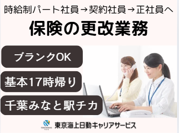 仕事の内容 \地元の安定企業で直接雇用/ ◆まずは時給制パート社員→契約社員→正社員への転換制度あり ◆休暇取得に理解のある環境 ◆17時定時&ほぼ残業なし@千葉みなと駅チカ 【基本情報】 雇用形態:紹介予定派遣(パート社員) 雇用期間:長期(3カ月以上) └1月~開始日相談可能 就業時間:9:00~17:00(休憩60分) └8:30~16:30も選択OK 【必須条件】 ◆保険業界で何かしらのご経験がある方 ◆パソコン:基本操作(入力~修正) 【お仕事内容】 火災メイン!お客様は銀行で働く方が中心です○ ・郵送・電話で契約期間満了のご案内 ・継続更新の手続き └入力、書類の受発送 など ◆入社後に生損保資格の取得をお願いします。 ・費用は会社負担○難しい試験ではないのでご安心ください 【直接雇用後の待遇】 ・実質時給1470円 ・1日200円食事補助あり ★担当者のおすすめポイント★ 早い方だと2年程で契約社員に転換される方もいるそうです。 正社員になると年収400万円超も…!年収&キャリアアップをしたい方は是非ご応募ください。 【環境面等】 ・40代・50代の多い職場 └子育てに理解ある主婦・主夫活躍中/TCS派遣スタッフさんご活躍中 ・穏やかで落ち着いた雰囲気 ・ランチタイムは休憩スペース利用OK └お弁当持参OKです ・オフィスカジュアル内で服装自由 └更衣室あり 【福利厚生等】 ・社会保険完備 ・禁煙オフィス!煙苦手な方も安心 ・平日のみOK!土日祝休み ・年間休日120日以上&お休み相談可 └有給休暇、年末年始休暇 安定した環境で、無理なくお仕事したい方にぴったりの職場です!ご応募お待ちしています! ○●嬉しいPOINTたくさん!●○ 直接雇用/紹介予定派遣/転勤なし/U・Iターン歓迎/昇給あり/開始日相談/駅チカ/駅歩5分以内/ブランクOK!社員に相談できる/資格取得支援//社会保険完備/残業月5時間以内!ほぼ17時退社/7時間以内勤務/交通費全額支給/残業代全額支給