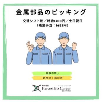仕事内容 具体的には 入荷された部品を、指示書に従いピッキングして、 専用の運搬具へ積んでいく作業です。 初心者でも、安心してお仕事が始められます♪
