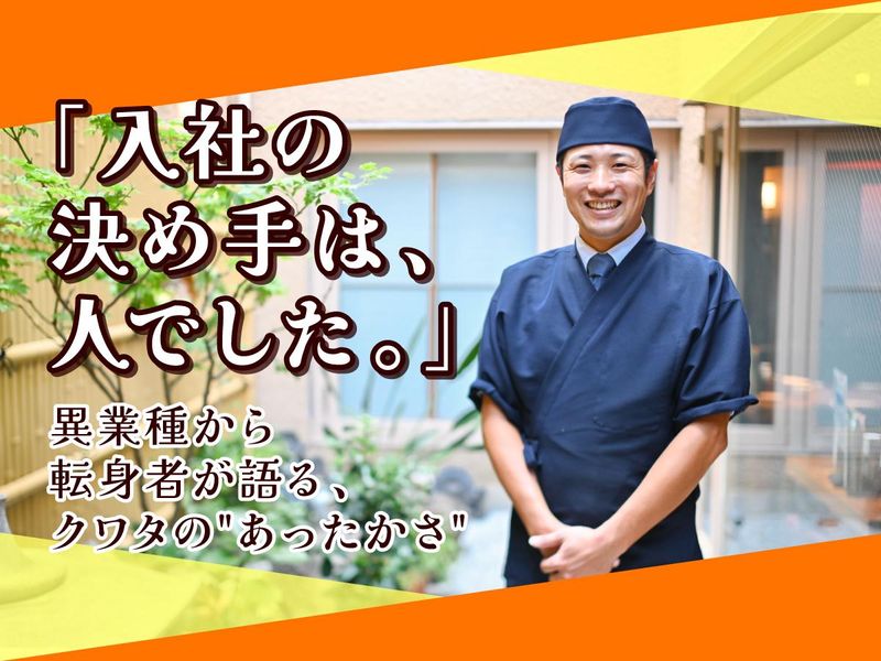 仕事内容 ★「あったかすぎるんちゃうか?」 というくらいスタッフの人柄がいい! ★できるようになるまで教えます! 「見て覚えろ」はナシ◎ ★13時スタートで朝はゆっくりめ◎ 月8日休み+独自の休暇制度で 家族との時間が増えたスタッフも! ★ユニークな福利厚生が多数! 各種手当に加えて独立支援や 社内イベント、ご家族向けの制度も有 - ―入社の決め手は "面接"だった。 そう語るのは、 「焼き鳥屋になる」夢を叶えるべく、 保険営業から転身した 入社4年目・30代の野添。 「店で串打ちからやってる会社を探して 見つけたのがクワタ。 面接はちょっとした衝撃で、 他社とは人の印象が全く違いました。 お会いした社長・専務・店長、 3人ともすごく明るくて、 ほんまにずっとニコニコ。 何社か選考は受けましたけど、 クワタの人に会って飲食業の イメージが刷新されたんです。 見て学べ、みたいな怖いイメージが クワタには一切ない。 保険営業っていう畑違いからの転職を だいぶ心配してくれて、 『一緒に頑張っていこう!』 っていう気持ちをすごく感じて。 ここなら料理未経験の自分でも、 ほんまにちゃんと教えてくれるな、 一緒に頑張ってくれる人たちやな、 と、確信を持てたんです。 ** 異業種から転職した彼の その後はどうなったのか…? 入社後の赤裸々話は、後半でご紹介! ▼ ▼ ■■■■■■■■■■■■■■■■■■ " 異業種から飲食業への挑戦 " " 未経験から独立の夢に一歩踏み出す " クワタで、スタートを切った社員多数! ■■■■■■■■■■■■■■■■■■ / クワタってどんな会社? \ 1933年、酒店から創業した当社。 お酒と相性のよい居酒屋、焼鳥専門店、 アイリッシュカフェなど新業態を開発。 事業を着実に拡大している、 西北エリア屈指の飲食グループです! - 【お仕事内容は…】 やきとり専門店「鳥半本店」の キッチンのお仕事です。 ■食材の仕込み ・鶏肉や野菜のカット、串打ち作業 ・タレやつけダレの準備 ・小鉢料理やサイドメニューの仕込み、調理 ・焼き場での焼き鳥調理 ・盛り付け、味付け確認 ・ 洗い物・清掃 ・在庫管理・発注補助 など 飲食業が初めての方もご安心を。 全くの未経験でキッチン業務を スタートした方も沢山います! まずは簡単なことから教えるので、 「やってみたい」の気持ちがあればOK。 少しずつできることを増やしましょう◎ ※経験者も無理なくステップUPできます。 ■………「鳥半」はどんなお店?………■ ★産地直送!「丹波地鶏」の炭火焼鳥専門店 ★毎日朝引き!毎日店で串打ち! ★創業以来26年継ぎ足しのタレ。 ⇒焼いた鶏ガラと野菜を入れて火入れする独自製法 ★自社ブランドだからフランチャイズとは違ってガチガチのマニュアルなし ★アイデアを店づくりにどんどん活かせる ★一軒家蔵造りの落ち着いた雰囲気のお店 ■……………………………………………■ まずは、お客さんとして食べに来ませんか? 面接はお互いを知るためのお見合い。 納得してから仲間になってほしいんです。 / 社員インタビュー 入社4年目・野添・30代 \ ■入社して驚いたことは? ―――――――――――― この4年間を振り返ってみても、 技術面でのプレッシャーや 理不尽に怒られるようなことが 1度もなかったこと。 料理にもこだわってる店ですけど 「技術はあとからついてくる」考え方。 入社3ヵ月間の研修では毎週面談と フィードバックがあるんですが、 振り返り項目に技術面は1つもない。 悩んでることはないか? 笑顔でやれているか? そういった面を本当によく見てくれます。 会社として1番大切にしているのが、 技術うんぬんじゃなくて「笑顔、活気」。 これがすべてにおいて とにかく一貫しています。 ■いい会社だなと感じるのはどんな時? ―――――――――――――――――― ―やっぱり、人ですね。 あったかすぎるんちゃうか? ってくらい人があったかい(笑) 社長や専務も、かなり距離が近くて 毎月会う機会があるんですけど、 「やっていけそう?」「大丈夫?」 と入社後もすごい気にかけてくれて。 店でだし巻き玉子を出してるんですけど、 僕、過去イチでうまくできなくて、 巻けるまで1年半かかったんです。 でも、先輩方は「こうやってみたら?」 「あんな風にやったらどう?」とか、 ほんまに熱心に教えてくれる人ばかり。 「はよ巻けるようにならなあかんで!」 なんて言う人、1人もいなかったです。 面接で感じた人の印象は、 ほんとうにそのままですし、 この会社の好きなところです。 ―――――――――――――――― しっかり休む働き方 しっかり稼ぐ働き方 その時々で選べます ―――――――――――――――― 今回募集するのは月8日お休みで 私生活と収入のバランスを 取りたい方向けの 「ワーク型②」の働き方。 他にも完全週休2日や月7日休みで その分、給与が変動する働き方もあり、 年2回変更希望のタイミングがあります。 収入やお休みを自分で調整できる 柔軟な体制もふじやグループならではです。 ――