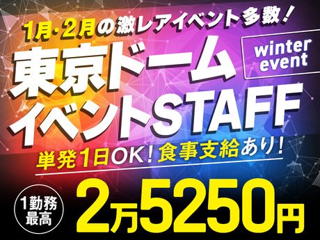 仕事内容 (σ・ω・)σイベント例はコチラ! >>>1/5~1/8・2/2~2/5 日本の8人組男性アイドルグループ >>>1/9~1/13 関西発7人組男性アイドルグループ >>>1/15~1/18 ソロでも大人気!韓国の4人組ガールズグループのワールドツアー >>>1/20~1/22 2019年デビュー!韓国の5人組ボーイズグループ >>>1/23~1/26・1/29・1/30 ポップ界の女王☆アメリカのシンガーソングライター >>>2/1 アイドル文化を世界へ!SNSでも大人気!日本のアイドルグループ >>>2/6~2/8 動画配信・歌い手・2.5次元アイドルグループなど人気グループが一堂に会する史上最大級の大型ライブイベント >>>2/9~2/11 芸歴20周年記念☆NY在住の女性人気芸人の単独公演 >>>2/13~2/15 作詞・作曲・編曲・デザイン・映像ディレクションまで手掛ける日本のシンガーソングライター・アーティスト >>>2/16~2/19 日本の2人組男性アイドルユニット >>>2/21~2/23 2023年デビュー!韓国の6人組ボーイズグループ など ★………………………………………………………★ ・期間内で1日~勤務OK! ※登録完了後、定員数の兼ね合いで 希望の日程で勤務できない場合もあります。 ※東京ドーム専属のアルバイト募集ではありません。 ★………………………………………………………★ (σ・ω・)σこんなオシゴト! コンサート・ライブ会場での 機材搬入出、グッズ販売、案内・受付 <機材搬入出> 照明・楽器・スピーカー・椅子などの 必要な機材を運んだり、 セッティングをしたりするお仕事。 ライブやイベントの裏側や完成するまでが 見れるレアな体験が出来ちゃいます! <グッズ販売> ライブやイベント会場などでの 販売・レジ業務。 <案内・受付> お客様のご案内やチケット確認など。 他にもイベント・展示会多数! 国内外のアーティスト、アイドルのコンサート、 国際的な展示会、毎年人気のフェスなど 年間を通して様々なイベントがあります!