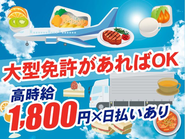 仕事内容 日払い対応&高時給1,800円でしっかり稼げるお仕事です 20~40代の男女が多数活躍中!未経験の方も大歓迎 【仕事内容】 飛行機の中で提供される機内食を運ぶお仕事です。 特殊車両(ハイリフトトラック)を使って、 できあがった機内食を積み込み、飛行機まで運びます。 機内では、リストを見ながら品物と数を確認し、客室乗務員さんへ引き継ぎます。 大型自動車免許を活かして、特別な場所で働けるお仕事です! 【魅力ポイント】 時給1,800円という高い水準で、 頑張りが直接収入に反映される点も魅力の一つです。 また、未経験の方も丁寧な研修制度が整っており、 機内食搭載業務が初めての方でも安心してスタートできる環境が用意されています。 経験者の方には即戦力としてすぐに活躍いただける場もあり、 自分のペースで成長と収入アップを目指すことができます。 【柔軟な働き方が可能】 20~40代までの幅広い年齢層のスタッフが活躍しており、 家庭やプライベートの時間を大切にしながら働ける職場です。 しっかり稼ぎつつ、プライベートとのバランスを取りたい方にもぴったりの環境です。 自分のライフスタイルに合わせた働き方ができるのも大きな魅力です。 【日払いOK】 「すぐに収入が欲しい」「月末まで待てない」 という方には日払い制度があり、 働いた分をその場で受け取ることが可能です。 急な出費があっても安心できる柔軟な制度なので、 余裕を持って働ける環境が整っています。 【応募の理由は問いません!】 「時給1,800円の高時給で働きたい」 「大型免許を活かしたい」 「安定した収入を得たい」といったどんな理由でも歓迎です。 少しでも興味があればまずはお気軽にご応募ください。 やる気さえあれば、あなたも安定した収入と働きやすい環境で、確実に成長できる職場です。 大型免許を持っているあなたの経験が求められています。 安定収入と成長の機会を手に入れ、やりがいを持って働きましょう!