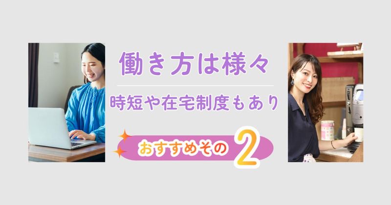 勤務時間詳細 9:00~18:00 *月~金の週5日(平日のみ) *時短勤務相談可(例:10~17時) *残業少なめ *在宅勤務は週2日程度可 (部署による) その場合PC、スマホ貸与します <働き方ご相談ください!> 「子供の送り迎えや食事の支度などで フルタイムでは働けない…」 →10時スタートや16時迄など 時短勤務も相談可! 「週に1日は趣味の時間に使いたい」 →週4日勤務も歓迎です! 契約更新期間:契約更新期間:更新回数12回(3年) 3年以降無期雇用契約転換の申し入れ歓迎!