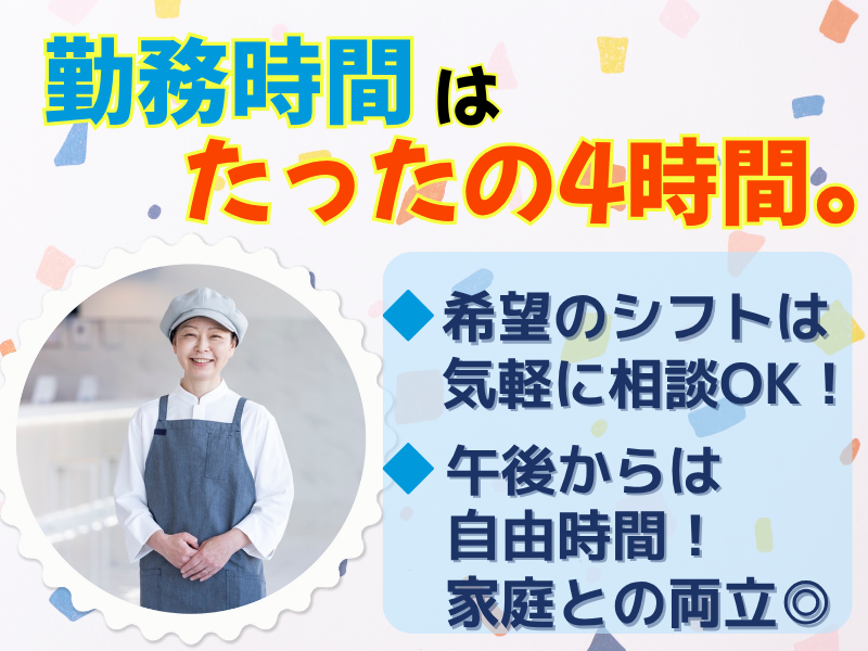 シフト制 勤務時間詳細 ⏰勤務時間 5:30~9:30  ̄ ̄ ̄ ̄ ̄ ̄ ̄ ̄ ̄ ̄ ̄ ̄ ̄ ̄ ̄ ̄ ※残業はほぼありません。 *仕事終わりは9:30! 勤務終了後は家でゆっくりも良し、 ちょっと早いランチも良し^^ 1日をたっぷり楽しめますよ ✨週2・3日~勤務OK!  ̄ ̄ ̄ ̄ ̄ ̄ ̄ ̄ ̄ ̄ ̄ ̄ ̄ ̄ ̄ ̄ *勤務希望曜日の相談OK *平日のみ・土日のみなどもOKです♪ 私生活×仕事が両立しやすい環境で、 みんなノビノビ働いています! 週2日から始めて慣れてきたら、 週4日、5日と増やしていくのもOK◎ シフトサイクル:1ヵ月 シフトの融通が利く職場環境です。 プライベート、家事、お子さんの行事など、 あなたの予定に合わせて働いていただけます。