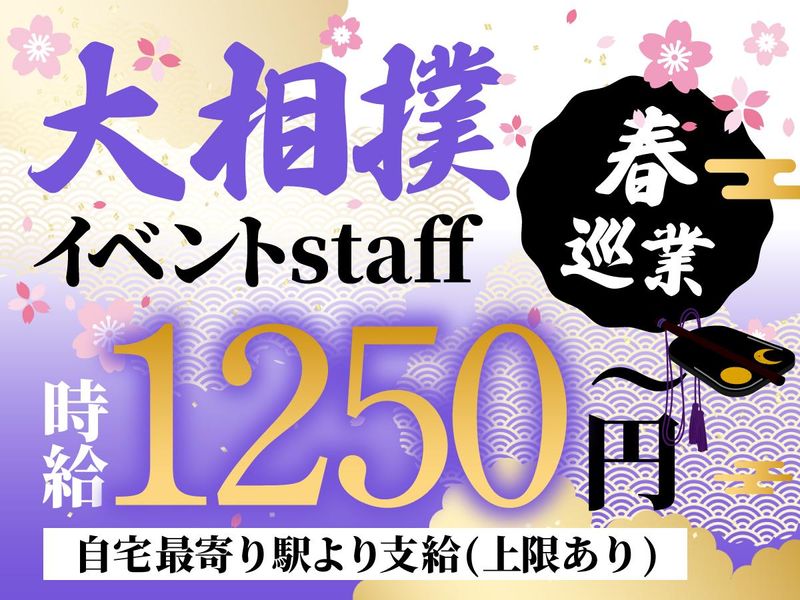 仕事内容 【3月31日限定】未経験歓迎◎ =============== 大相撲巡業イベントスタッフ募集 2日だけの特別な体験&高時給♪ =============== 3月31日に開催される 「令和8年春巡業 大相撲神戸場所」 支えるイベントスタッフを大募集! 会場を訪れるたくさんのお客様に、 楽しい時間を提供する大切なお仕事です◎ 短期間で特別な体験をしたい方にピッタリ! ▼具体的には… ●受付:来場者の受付、チケット確認 ●誘導:来場者の会場内外での案内・誘導 ●物販:公式グッズや記念品の販売補助 ●会場設営・撤去: マスキングテープで養生を施す 開場準備/イベント終了後の片付け作業 ※重たい物はございません ▼実施日程 3月31日 本番 空いた日を有効活用できます!! イベントスタッフ経験がなくても、 ベテランスタッフの指導があるので安心♪ 昼食も支給されるので、 体力仕事でもしっかり集中できます! ▼ご持参いただくもの ●腕時計 ※時間管理のためスマホ以外の時計を 必ずご持参ください ●筆記用具 ┗簡単な記録を取る場合があります ▼服装 3月30日(前日) 3月31日(本番日) ・黒綿パンツ ・上着(黒系のシンプルなもの) ・スニーカー ※体育館のため、 上履きをご用意頂けると助かります。 ご用意が難しい方は靴カバーを着用いただきます(当日支給) ※当日ビブスを貸与します。 ※原則として華美な服装やアクセサリー類は ご遠慮ください。 ▼アピアランス ・清潔感のある髪型にセットし寝癖の無いようにする。 ・髪の⻑い⽅は⿊・茶・紺のヘアゴムで⼀つにまとめる(シュシュNG) ・男性黒髪のみ ・女性過度な茶髪はNG ・ヒゲはキレイに剃り、⽖は短く切ってくる ※ネイルアートNG ※マニキュアは透明か薄いピンクであれば可 ・女性はメイクをした状態で集合(すっぴんNG) ・腕時計以外のアクセサリー類の着用、⾹⽔の使用、ピアスはNG *★*★*★*★* ▼この求人の魅力ポイント <POINT1>特別な体験ができる! …………………………………………………… 普段なかなか関わることのない 大相撲イベント!! 貴重な裏方の体験ができ、 スポーツやイベント好きには たまらない内容です♪ <POINT2>手厚いサポートで安心♪ …………………………………………………… お昼ごはんが支給されるので 余計な準備などは不要◎ さらに、ベテランスタッフが しっかりサポートするので 未経験でも安心して働けます♪ <POINT3>仲間と一緒に作るやりがい! …………………………………………………… イベントを成功に導くのはチームワーク。 大勢の仲間と一緒に働きながら、 達成感や充実感を味わえます!! *★*★*★*★* ▼当社について 当社は全国のイベント運営を支える運営会社です☆ 大規模スポーツイベントや 地域活性化イベントを 数多くサポートしてきました。 未経験の方でも、 楽しく安心して働ける環境をご用意しています!