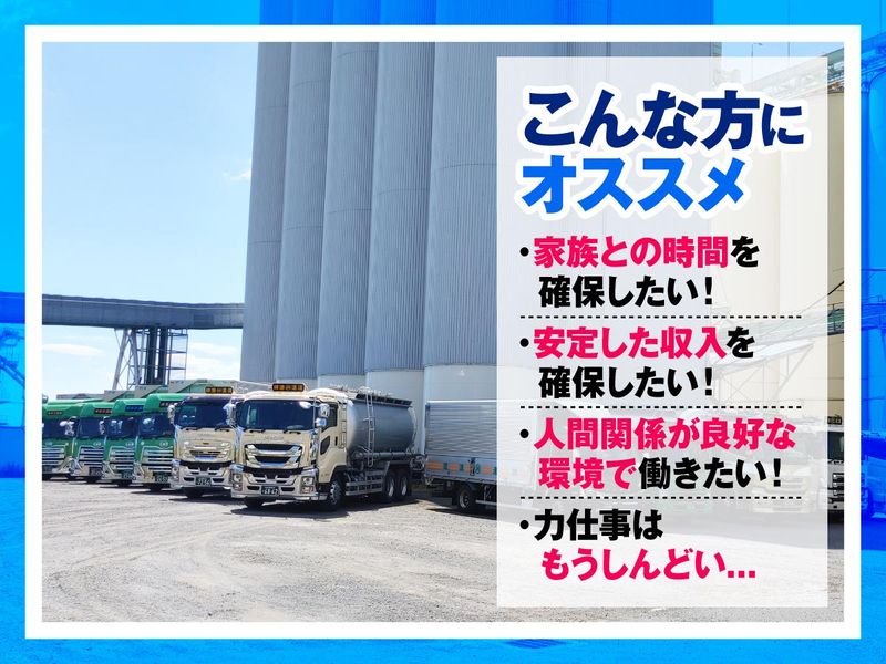 仕事内容 「中型から大型車にステップアップしたい」 「家族との時間を大切にしながら働きたい」 「1人でマイペースに集中して仕事がしたい」 そんな想いで転職先を探している方に、 ぜひおすすめしたいのが弊社。 僕自身、4tドライバーから転職して 大型バルク車のドライバーになりました。 今では特殊車両を完璧に操れるようになり、 休日は奥さんと釣りに行くなど プライベートもめちゃめちゃ充実しています。 大型ドライバー未経験から スタートした僕から、 うちの会社をご紹介します! (40代・バルク車ドライバー) 【Q.1】バルク車ドライバーって何?  ̄ ̄V ̄ ̄ ̄ ̄ ̄ ̄ ̄ ̄ ̄ ̄ ̄ ̄ ̄ ̄ ̄ ̄ ̄ バルク車(粉粒体運搬車)という特殊車両で 大手製粉会社様の小麦粉を配送するお仕事です。 配送先は主に、製パン会社や製麺会社。 配送は基本1日1件、多くても2件程で、 愛知県内や関西方面への近~中距離配送です。 ★宿泊を伴う運行はなし!毎日家に帰れます。 ★早出・宵積みもありますが、その分早く帰宅。 自分時間や家族との時間もしっかり確保できます◎ 【Q.2】バルク車ならではの魅力は?  ̄ ̄V ̄ ̄ ̄ ̄ ̄ ̄ ̄ ̄ ̄ ̄ ̄ ̄ ̄ ̄ ̄ ̄ ̄ バルク車の最大の魅力は、 「特殊車両のプロフェッショナルになれる」こと。 機械を使って小麦粉の積み下ろしを行うため、 力仕事が圧倒的に少ないのも特徴です。 ★機械の操作さえ覚えればあとはラクラク! ★特殊車両ならではの操作を 完璧にこなせた時の達成感は格別です。 ★「初めは自信が無くても、やりこなせた!」 という瞬間が何度も訪れます。 【Q.3】4tドライバーから転職した理由は?  ̄ ̄V ̄ ̄ ̄ ̄ ̄ ̄ ̄ ̄ ̄ ̄ ̄ ̄ ̄ ̄ ̄ ̄ ̄ 「大型車のドライバーになりたい」 これが一番の理由でした。 4tトラックでは給与も頭打ち。 でもこの会社なら、大型免許を活かして ステップアップできる環境がありました。 ⏩走れば走るほど稼げる歩合制度付き! ⏩20代から月40~45万円も可能! ⏩昇給・賞与あり&福利厚生も充実。 家族を守るために、収入と安定を重視して 転職先を選んだ僕にとって、 この条件は大きな魅力でした。 【Q.4】大型ドライバー未経験でも大丈夫?  ̄ ̄V ̄ ̄ ̄ ̄ ̄ ̄ ̄ ̄ ̄ ̄ ̄ ̄ ̄ ̄ ̄ ̄ ̄ 大丈夫です!僕も最初は不安でした。 でも、入社後は先輩社員が、 積み下ろし機械の手順や 各お客様ごとのルールをしっかり教えます。 もちろん最初は横乗りからスタート! ★研修期間は人によって異なります。 いち早く成長される方は 研修期間が短縮されることも◎ ★わからないことは何でも聞いてください。 あなたの成長を精一杯サポートします! 完璧になるには1年ほどかかりますが、 「素直に仕事に取り組む」姿勢が あれば大丈夫です。 気が長く、コツコツ頑張れる方なら 必ず活躍できます! - 【1日のスケジュール例】 4:00~5:00頃 出勤・点呼 ↓ 午前中 配送先へ出発 (愛知県内・関西方面など) ↓ 昼頃 好きなタイミングで昼食 (お弁当やおにぎりを持参) ↓ 午後 納品完了後、翌日分を積込 ↓ 13:00~17:00頃 日報を書いて退社 ※運行スケジュールにより変動あり ※早出の分、早く帰宅できます! ※基本的に始発より前にご出勤いただきます。