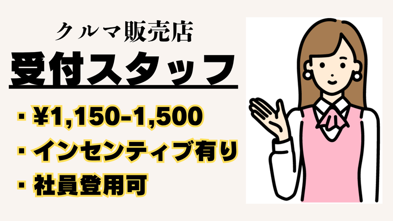 仕事の内容 クルマ販売店で受付業務をご担当いただきます。 電話での車検受付など、成果に応じてインセンティブ支給あり! おすすめです! 【募集の特徴】 ・1日4時間~、週3日~応相談 ・急なお子さんの体調不良などで休むのはもちろん可能 ・ご希望により正社員登用の可能性あり 【基本的な業務内容】 ・来店されたお客様に店舗の案内 ・商談になるときはブースへの案内とお茶出し ・その他、事務関連業務 【当社について】 ・当社は新車、中古車の販売店を事業としています。 ・店舗は2022年にできたばかり。20代~40代が中心メンバー。 少しでもご興味を持った方は気軽にご応募くださいね。