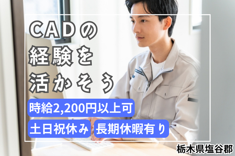仕事内容 【 応募から2週間程度で内定可能! 】 《 ここがポイント! 》 ●時給2200円以上!高月収40万円以上可能 ●Uターン・Iターンの方歓迎 ●土日祝休みでプライベート充実! ●男性活躍中 《 こちらは経験者募集の求人です 》 自動車部品の設計開発業務アシスタントを お願いいたします。 CATIA(V5またはV6)と言われる 3DCADアプリケーションを使って 自動車部品の設計を行います。 ■実際に設計するプロジェクトは… ・プロジェクトドアミラー設計補助 ・ドアハンドル設計補助 ・センサー類設計補助 ・2輪車部品設計補助 各プロジェクトは5?7名のチームでお仕事を進めます。 パソコンを使っての作業になるので、 モクモク集中して作業をしたい方におすすめです♪ - 《 清潔感あふれるオフィス! 》 大手企業での就業になるので、 キレイなオフィス内で 快適にお仕事ができます♪ - 《 CADなどの経験が生かせる! 》 CATIA(3DCADアプリ)を 使用した作業になります。 CADなどの経験を充分に生かして お仕事ができます! 長期就労も大歓迎♪ 自動車部品の研究開発に携われるので、 自動車に興味がある方におすすめです! - 《 ワークライフバランス重視! 》 ・日勤専属 ・土日祝休み ・残業20時間以内 ・長期休暇有り ワークライフバランスを 叶えることができるお仕事♪ 休日と仕事のメリハリを つけることがでるので おすすめです! ★大企業なのに転勤無し!