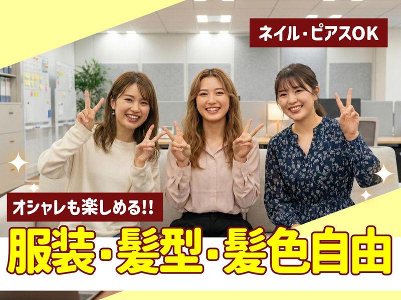 【保険制度】 雇用保険、労災保険、健康保険、厚生年金 待遇・福利厚生 【福利厚生】 ・社会保険完備 ・交通費規定支給(月上限3万円まで) ・車通勤OK(ガソリン代規定支給) ・無料駐車場完備 ・有給休暇 ・各種特別休暇(有給/無給) ・各種保養所 ・研修あり ・産休・育休制度 ・正社員登用制度 ・お友達紹介制度 ・企業主導型保育園の提携有り ※各条件あり ★服装自由:デニム、スニーカーOK! ★髪型・髪色自由! ★ネイルOK:タイピングに支障のない範囲でOK! <職場環境> 休憩室完備(冷蔵庫、電子レンジ、給湯設備、自販機あり)