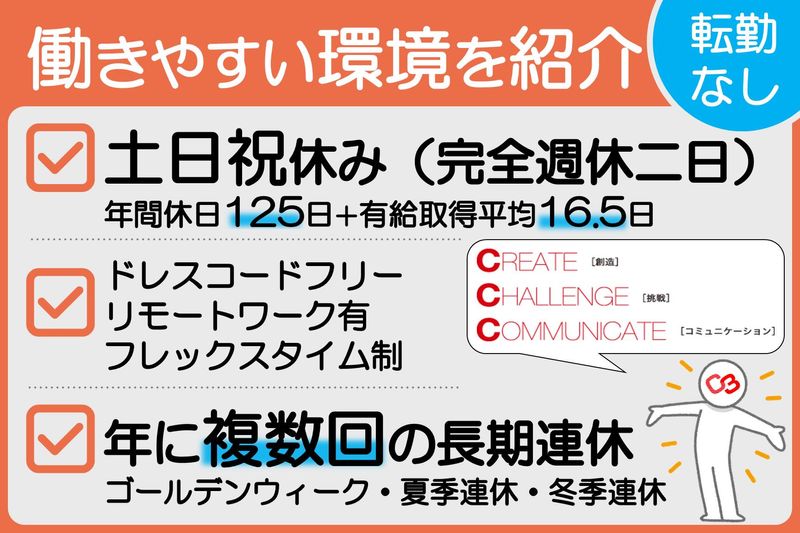 職場環境 \ 長く安定して働きたくなる / 福利厚生も休日も充実しているため 若いころから長く働くスタッフ多数! 未経験から挑戦したい方を 応援します! *会社全体の平均年齢は37歳 *完全週休2日制(土日祝休み) *各種手当充実 *平均勤続年数13年 喫煙所:喫煙所あり(屋内)