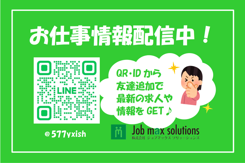 選考プロセス 面接時には履歴書をご持参下さい。 面接日・入社日は相談に応じます。 お電話でのご応募も受け付けております。 【お電話】0476-36-7130 ※受付:採用係 【登録地】 株式会社ジョブマックスソリューションズ 所在地:千葉県成田市花崎町799-8 東海住宅ビル2F 担当者:成田オフィス採用担当 電話番号:0476367130 メールアドレス:narita@jobmax.jp