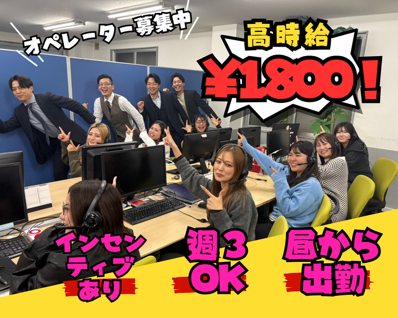 仕事内容 / コールスタッフ募集! 1月6日(火)もしくは 1月19日(月)のご入社となります! ✨未経験の方も大歓迎!✨ 明るい職場で楽しく働ける! \ <この求人のおすすめポイント!> ✅土日祝休み×週3日~希望OK ✅服装・髪型オシャレ100%自由!ロングネイルも楽しめます ✅頑張りに応じてインセンティブ有♪ ✅9時半~・12時~が選べます! _/_/_/_/_/_/_/_/_/_/_/_/_/_/_/_/_/ 【 仕事内容 】 コールセンタースタッフ大募集! ①建設業の企業様に 外国⼈技能実習生のご案内︕ 「技能実習生を受け入れませんか?」 とお電話でお伝え ↓ アポ取り ↓ トスアップ ②法人企業向けに 電気代削減サービスのご案内! 「今よりお得に使える電気料金のプランがあります!」 とお電話でお伝え ↓ アポ取り ↓ トスアップ どちらかのサービスのご案内をお任せします✨ ※A4用紙1枚の簡単なトークでアポ獲得✨ ※外国語が話せなくてもOK! ※先輩も全員未経験から始めたので、 研修・フォロー体制も充実! _/_/_/_/_/_/_/_/_/_/_/_/_/_/_/_/_/ ⭐未経験の方も大歓迎! 特別な経験や知識は一切不要! 「電話対応は初めて…」という方でも大丈夫です。 研修やマニュアルがしっかりあるので、安心して始められます。 イチから学んでスキルアップしながら高時給をGET! ⭐週3日~シフト自由! 長期で安定して働きたい方にピッタリ! 入りたいのにシフトが減らされる・・・ なんてこともありません! プライベートとの両立もバッチリ!