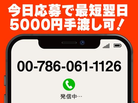 選考プロセス 電話応募で、その場で研修日時のご予約ができます。 あっという間にお仕事決定♪ ▼ご応募はこちらから▼ 【00-786-061-1126】 【問合せ先について】 問合せ先:0078-6061-1126 <TEL受付時間>平日9:00~17:00、それ以外の時間帯はWEBにて24時間受付中! 応募方法 ▼ご応募はこちらから▼ 【00-786-061-1126】 面接なし!来社なし!電話1本で完結! 簡単な確認のみで即内定! 自宅にいながら内定GET&履歴書不要!