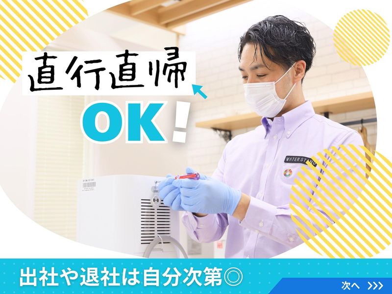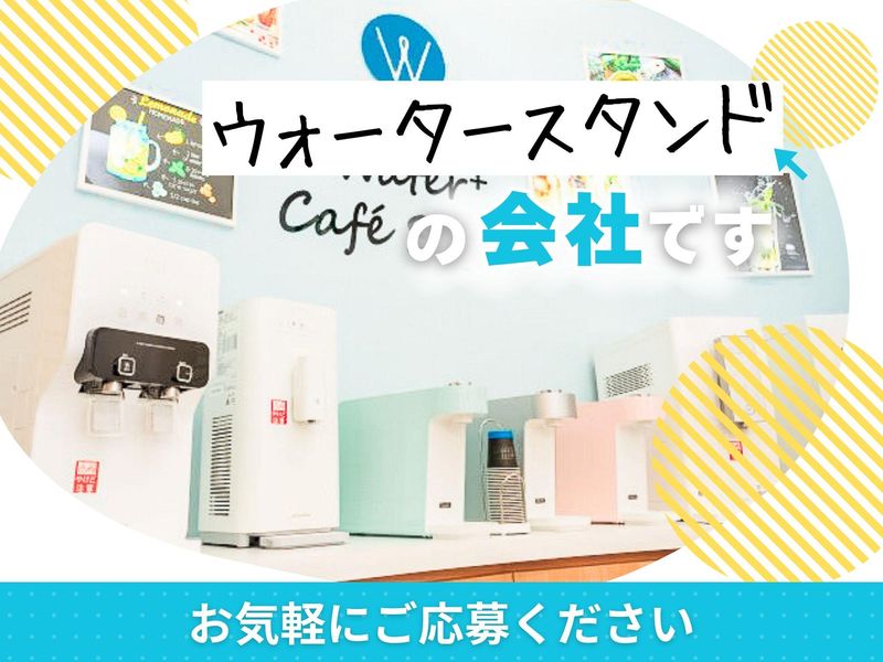 仕事内容 / 働き方の概念が変わる!? ストレスフリーで 自由な働き方を.・☆* \ . 業績好調!! 営業スタッフ増員募集♪ . ================= この求人のポイント♪ ================= ◆経験・スキル不問! <普通免許があればOK>です☆ ◆年間休日<120日以上!> ◆未経験も安心の<サポート体制完備♪> ◆<スーパーフレックス制>で 理想の働き方が実現♪ ◆ノルマはありません!! . . ================= 仕事内容はこちら! ================= . ✅サーバーメンテナンス  ̄ ̄ ̄ ̄ ̄ ̄ ̄ ̄ ̄ ̄ ̄ ̄ フィルター交換や作動チェックなど 既存のお客様先にて メンテナンスを行います! 1件40分ほどの時間が掛かるので お客様とのお話しを楽しみながら 作業をお願いします♪ 設置から修理まで、やり方は 研修でしっかりレクチャー! . ✅新規顧客対応  ̄ ̄ ̄ ̄ ̄ ̄ ̄ ̄ 電話やSNSからお問合せいただいた 新期のお客様先にて、 お客様の要望をヒアリングし 最適な機種のご案内を行います! . ✅設置・交換・撤去  ̄ ̄ ̄ ̄ ̄ ̄ ̄ ̄ ̄ ̄ ご契約されたお客様先にて ウォータースタンドの設置を行います! . . もちろん、 社用車や制服 タブレットや携帯電話などの 業務に必要なものは貸与! 設置方法や お手入れ方法のご説明などは 入社後にしっかり研修を行うので どなたもご安心くださいね♪ . . ================= 安心の<サポート体制!> ================= ◆入社後、まずは座学研修で 商品知識や訪問マナーなどを 基礎から丁寧にレクチャーします! . ◆座学研修後は、OJT研修で 先輩に同行し実際の現場を 学んでいただきます! . ◆独り立ち後も 階層別の勉強会や研修を実施♪ . 更に・・ 週に一度、 上長との面談を設けています。 ◎実務上のトラブル解決方法 ◎アドバイス・フォロー などなど・・ 些細なことから 相談できる環境が整っています♪ 安心してご応募ください☆ . . ============== <直行直帰>可能! ============== ご自宅から直接 お客様先へ訪問をし、 そのまま直帰OK! 勤務時間や休日は 自分で決められるので 週休3日の働き方も◎ フレックスタイム制ならではの 働き方が実現可能です♪ あなたが「働きやすい!」と思える ワークライフを見つけていきましょう! . . ============== 1日のスケジュール例 ============== 9時 自宅から出発! メンテナンスで3件訪問 12時 ランチタイム♪ 13時 新規のお客様先へ! しっかりヒアリングし、 お客様に合った機種をご案内♪ 15時 設置作業で2件訪問 17時 自宅へ直帰♪お疲れ様でした! . あるスタッフの1日の例ですが 上記のような働き方が可能です♪ . . =============== ウォータースタンドについて =============== 当社は、 「 2030年までに日本の 使い捨てプラスチックボトルを 30億本減らします。 」 というミッションを掲げ マイボトルを携帯する 新しい文化を創り、 気候変動とプラスチックによる 環境問題改善に取り組んでいます! . 一般のお客様だけでなく 官公庁や公共施設、 企業などのお客様からも 幅広く支持いただいております♪ このような信頼のもと 事業は右肩上がりで成長中! . ☆SNSでも話題のウォータースタンド☆  ̄ ̄ ̄ ̄ ̄ ̄ ̄ ̄ ̄ ̄ ̄ ̄ ̄ ̄ ̄ ̄ ̄ ̄ . // あなたのご応募を お待ちしております! \\