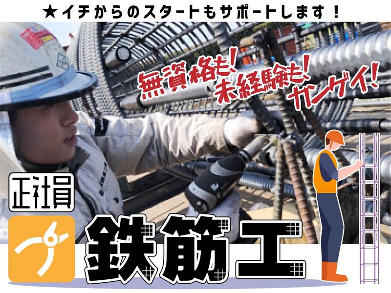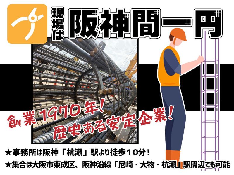 仕事内容 マンション、学校、ビルなどの基礎となる鉄筋工事作業です。 ■月給28万円スタート!【平均月収37万円で安定雇用】 ■未経験・無資格大歓迎!まずは手元の仕事から一つひとつ覚えていきましょう! ■まずは「体験・見学」からでもOK! ■わからない事も何でも聞きやすい環境です!全員でしっかりサポートいたしますので安心してください◎ <作業現場について> ■現場は阪神間一円!(現場により直行直帰も可) ■集合については、事務所、事務所以外でも集合可能。 └事務所/尼崎市杭瀬南新町4-1-25…阪神「杭瀬」駅~徒歩10分 └大阪市東成区…地下鉄「今里」駅スグ └阪神沿線…「尼崎・大物・杭瀬」駅周辺でも可能です。 ■車・バイク通勤もOK! ■寮への入居希望も大歓迎です! <「収入・休日・待遇」が充実> ★未経験、無資格の方大歓迎!「月給28万円スタート」「昇給制度」「賞与」や「各手当」「入社祝金10万円」「日払い・週払い」など稼ぎやすい環境と体制、休日や待遇などを整えております! ★長く安心して働いて頂けるようしっかりサポートいたします。 <人間関係も安心> ★幅広い年齢の社員が活躍中!馴染みやすい社員ばかりで、溶け込みやすい環境です◎ ★イベントや行事など皆で過ごす事もあり、一緒に楽しみながら信頼関係を育んでいます。 ★現在は18名が活躍中!ほとんどが未経験からのスタートで、コツコツとキャリアを重ねている社員ばかりです。スタート時の気持ちを理解してくれるメンバーが揃っているので、安心して学べる環境が整っています。