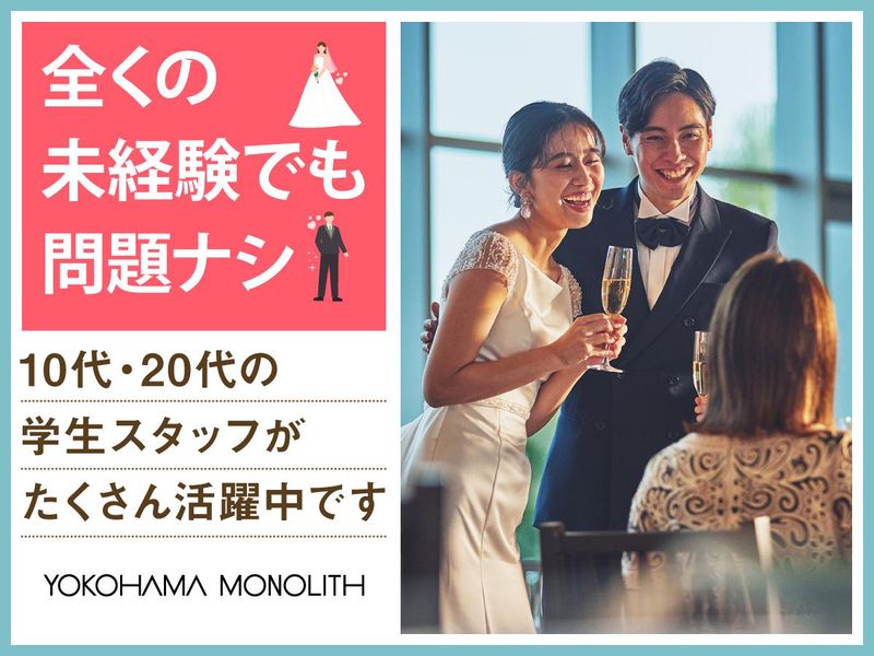 仕事内容 *オーシャンビューの結婚式場* 感動いっぱいの結婚式を一緒にサポート♪ 授業やサークルのない日に勤務OK★ WワークOKで学生スタッフ多数活躍中! 「人が喜ぶ姿が好き」「サプライズが好き」 という方必見!スキルや経験は一切不要♪ 一緒に素敵な結婚式を演出しましょう* 横浜モノリスは みなとみらいの景色を一望できる オーシャンビューの結婚式場。 ウェディングのお手伝いをするお仕事です◎ <主なお仕事内容は…> 結婚式場スタッフとして 次のお仕事をお任せ! ■会場の準備 ■お客様の上着や荷物のお預かり ■お席のご案内 ■結婚式のお料理・ドリンク提供 ※キッチン業務はありません◎ ―――――――――――――――― 学生が活躍中! オススメポイントはこちら★★ ―――――――――――――――― ・授業やサークルとの両立応援! ・週1日~1日4時間~OKで融通◎ ・絶品のまかないアリ(^^) ・同世代が多くて安心◎ まかないは本格料理人たちが 美味しい食材を使って作ってくれます♪♪ 現在はアルバイト・パート8名が在籍中! そのうち学生4名が活躍しています! お友達同士の応募も大歓迎です! 一度バイトを始めると長く 続けてくれる子が多い横浜モノリス。 敷居が高いイメージがあるかもしれませんが みんなで協力しながら準備して… 毎日、文化祭みたいな雰囲気なんです♪ 素敵な仲間に出会える そんな場所になると思います◎ ついでに… 社会で活躍するためのマナーも学べますし、 実は就活に役立つのもうれしいポイント! ―――――――――――――――― 特別な1日をサポートするお仕事 具体的な仕事の流れは? ―――――――――――――――― ▶STEP.1 ミーティング 披露宴の流れやお料理について スタッフ間で事前に確認して 式中にバタバタしないようにします◎ ▶▶STEP.2 披露宴会場の準備 お席に置く名札や ゲストの方に渡す引き出物を確認したり グラスを磨いたりして準備します。 ▶▶▶STEP.3 お客さまのお出迎え 荷物をお預かりし、 待合室でドリンクをお出しします! ▶▶▶▶STEP.4 ホール業務 お席にご案内し、順番にお料理や ドリンクを提供します◎ ―――――――――――――――― 未経験者歓迎! みんなで助け合う雰囲気です ―――――――――――――――― 最初は結婚式の見学からスタート! 見学後は本番じゃないところで、 同世代を集めて研修を実施。 飲食業やホールスタッフが 初めての子には、 お盆の持ち方から教えます!