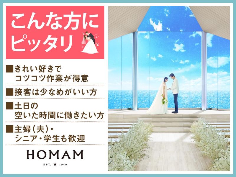 仕事内容 *駿河湾を望む絶景の結婚式場* 2026年3月オープン予定の新しい式場で、 オープニングの清掃スタッフを募集♪ 感動いっぱいの結婚式場の立ち上げを 一緒に楽しんでみませんか? 週2~の柔軟シフトでWワーク・副業OK! フリーターさんや主婦パートさん、 50代・60代のシニア世代の方も活躍中♪ 「きれい好き」「黙々作業が好き」 そんな方にピッタリ! 経験・年齢は不問! 幅広い世代が活躍できる環境です♪ HOMAM 旧マッケンジー邸は 国登録有形文化財の洋館と調和した 駿河湾の絶景を一望できる クラシカルな結婚式場。 結婚式という特別な1日を、 快適な空間づくりで支える清掃スタッフを募集します。 <主なお仕事内容は…> 婚礼や宴会が行われている最中の、 館内&外回りの清掃業務をお願いします。 ■館内の床や窓の清掃 (掃除機がけ、窓拭きなど) ■外構の落ち葉の掃き掃除 ■トイレ清掃 ■会場のごみ回収 など ※接客業務はありません ※基本は一人での作業でモクモク働けます! ―――――――――――――――― オススメのポイントはこちら★★ ―――――――――――――――― ・週2日~1日3時間~OKで融通◎ ・学校や本業が休みの土日だけ等大歓迎! ・かけもち・副業OK! ・スキマ時間に働ける♪ 系列店ではフリーター・パート主婦さん・シニアアルバイトさんなど幅広く在籍中! 幅広い年代が無理なく働ける環境です♪ ―――――――――――――――― 未経験者歓迎! 経験ある方は優遇します◎ ―――――――――――――――― しっかりした教育制度があるので、 未経験でも安心してスタート! 「清掃のお仕事は初めて」 「子育てでブランクがあって不安」 「働くこと自体久しぶり…」 そんな方もご安心ください。 入社時は経験・スキルは一切不問! 不安がなくなるまで、 スタッフ全員でサポートします◎ ―――――――――――――――― 新式場での営業開始に向けて、 最初は研修からスタート! 「結婚式でのバイトは初めて」 そんな方もご安心ください。 不安がなくなるまで、 スタッフ全員でサポートします◎