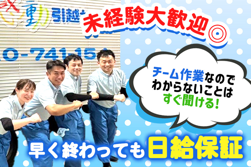 仕事内容 / 春休みに向けて出費増える今がチャンス⭐ 未経験も大歓迎! 引越し作業スタッフ募集! \ 春の繫忙期に向けて 新しいスタッフを積極採用中です✨ 面接はカジュアルに行いますので 気になったかたは、お気軽に応募してください! アクティブ感動引越センターは 『オリコン顧客満足度において第1位』を 2年連続で受賞した引越し企業となります◎ ただ物を運ぶだけじゃなく お客様の新生活や思い出を運ぶ仕事をしています! スタッフ同士の仲もよく 声を掛け合いながらチームで動くので バイトデビューでも安心です! 最初は分からないことだらけでOK! 先輩がしっかりフォローするので 学生さん・未経験の方も安心してスタート✨ 「ありがとう!」と直接言ってもらえることも多く お金だけじゃなくやりがいも 感じられるのがこの仕事の魅力! 《 仕事のながれ 》 出勤後、皆で協力して準備スタート! 準備ができたらトラックに乗って出発! お友達同士でのシフトINもOK◎ ▼ お客様宅に到着したら、 ご挨拶後早速作業スタート! ▼ 冷蔵庫などの重たい物もありますが、 声を掛け合いながら安全第一で作業を進めます! ▼ 作業後は、お客様の笑顔や 「ありがとう!」の言葉が達成感になります✨ 重たい荷物を運んだりするので 筋トレ効果も!?(笑) トレーニング目的の応募や 体を動かしたい目的の応募もOKです◎ ⭐『アクティブ感動引越センター』で働く魅力”⭐ ⏩【1】給料は即日GET可★ 働いた分のお給料は日払いOK◎(規定あり) 「今すぐお金がほしい…」という時も安心♪ 春にむけての出費や急な予定にも対応◎ 日給保証もあるのでしっかり収入を確保◎ 1ヶ月で30万以上稼いだスタッフもいますよ✨ ⏩【2】未経験も大歓迎! 特別なスキルや経験は一切不要。 作業の流れは先輩スタッフが丁寧に教えます! 2〜4人のチーム作業が基本なので、 一人で作業を任されることはありません◎ 重量物も複数人で運ぶので安心してください! 体を動かす仕事なので 時間が過ぎるのもあっという間です! ⏩【3】自由シフト制! 春の繁忙期に向けて シフトに入れない日はほとんどなし! 週1日〜の勤務もOK◎ もちろんレギュラー勤務も大歓迎です! 安定して稼ぎたい方も 空いた日だけ働きたい方もピッタリ! 長期で勤務できる方は特に歓迎します✨