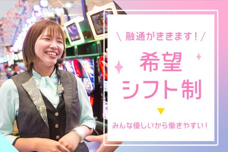 仕事内容 << ”働きやすさ”と”高収入”、どちらも叶う >> 前月にシフトを調整できる【希望シフト申告制】 勤務は週3日~・1日4h~◎ もちろん、週5日×フルタイムもOK! 「レギュラー勤務でしっかり稼ぎたい」 「家事や育児と両立しながら働きたい」 「学校が休みの土日中心に入りたい」 など、ライフスタイルを考慮したシフトが叶います! また、研修初日からでも時給1200円~スタート! 更に22時以降は時給1500円~と時給UP! 働きやすさと高収入どちらも叶います◎ ★土日祝は更に+100円アップします!★ << 未経験スタートの方も大歓迎! >> 《主な業務内容》 ◆お客様のお出迎え・お見送りのご挨拶/ご案内 ◆玉箱交換/計数機対応 ◆遊技台のトラブル対応、清掃、除菌 ◆お呼び出しアナウンス ◆賞品カウンターでの交換対応 など 入社後の研修で接客マナーを きっちり学べるのでスキルアップが可能です! 【 玉箱交換って何?? 】 パチンコ台にいっぱいになった 玉の箱を運び、空の箱と交換すること◎ 玉の数は計数機が数えてくれますし、 無理のない配置・交替制で行うので 1人に負担が集中することはありません♪ << 充実の研修有!同年代の先輩も多数 >> 接客が初めての方やバイトデビューの方も大歓迎! 未経験スタートでも、 安心して始められる教育体制が整っています。 *基本の接客対応マニュアルあり! *先輩がトレーナーとしてしっかりサポート! *同年代のスタッフが多く、馴染みやすい環境! *高時給&充実の福利厚生で働きやすさバツグンです! \ 最初は何も分からないのが当たり前 / 「この用語って何?」 「こういう時はどうするの?」など、 不安なことはスグに質問できます!!