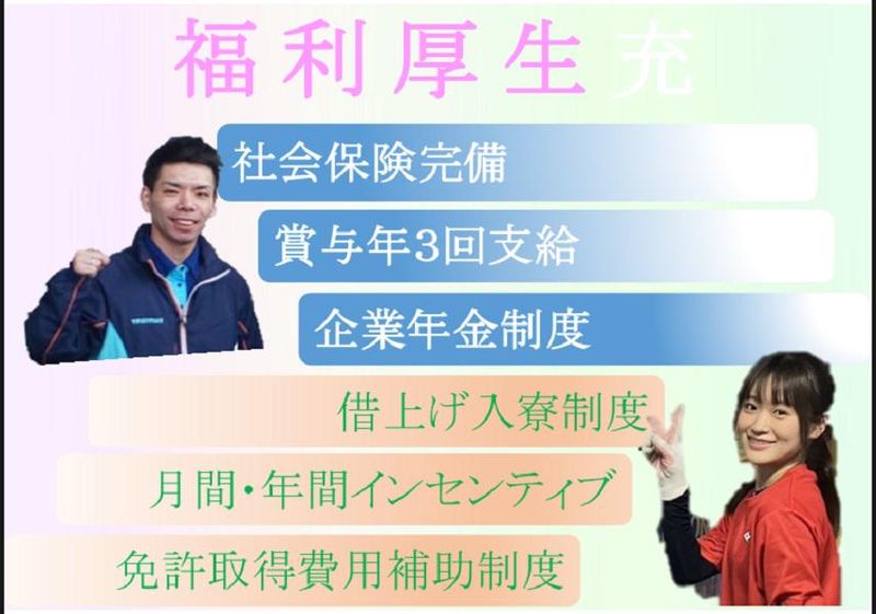 【保険制度】 雇用保険、労災保険、健康保険、厚生年金 待遇・福利厚生 【福利厚生】 ◆賞与年3回(7月・9月・12月)→年間64万円※昨年度実績・本年度も同水準予定 ◆寮完備→会社負担25,000円 ◆準中型免許取得費用(全額会社負担) ◆交通費全額支給 ◆社会保険・雇用保険・労災完備 ◆残業手当あり ◆退職金制度あり ◆昇給あり ◆結婚・出産祝い金あり ◆年間無事故手当→1年間無事故 5,000円 5年間無事故 50,000円 ◆年末年始手当あり(4,000円/日)→12/31~1/3出勤者 ◆資格取得支援制度(通信教育で学べます) ◆各種研修制度あり ◆制服貸与 ◆永年勤続表彰 ◆社内表彰制度 ◆パパ育休制度あり
