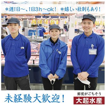 仕事内容 テイクアウト寿司や新鮮なお魚を活かしたお惣菜の販売と、イートインでのお食事をご提供してください。 「魚と海鮮鮨酒場 街のみなと」ルクア大阪店での、 接客・レジ・商品陳列などの販売業務をお願いします。 レジは、お釣りが自動で出てくるタイプのものなので、 釣銭ミスの心配はありません。 「初めてのアルバイト」「飲食や販売は未経験」という方も、経験豊富なフリーターさんも、みなさん大歓迎! 関西エリアで多くの店舗を展開する大起水産グループだから、 アルバイト・パートさんの受け入れ体制は万全。 サポート体制が整っています。 「たくさんシフトに入りたい」というフリーターさんも大歓迎! \大学生や高校生をはじめ、フリーター、主婦(主夫)が活躍中!/ 10代・20代・30代・40代・50代まで幅広く活躍中! 急なお休みも相談しやすいのが魅力。 スタッフ同士で話し合ってシフトを調整したりと、 協力体制も抜群です。 \美味しいお寿司が食べられる!お得な社割はスタッフからも好評/ 昇給や交通費支給、友人紹介制度など福利厚生も充実しています。 嬉しい従業員割引あり! さらに友人紹介で1万円支給(規定あり)! 社員登用制度があるので、アルバイトから始めて 社員になったスタッフもいます。