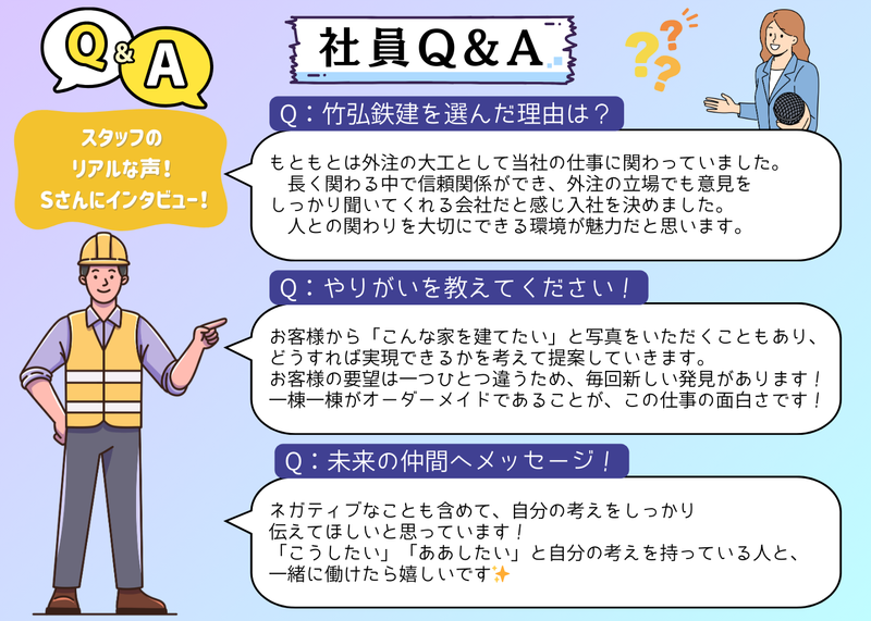 仕事内容 \\新築・リフォームの施工管理// 「派遣ではなく、自社の正社員として」柏原に根付いて働く! ✅竹弘鉄建とは...? 50年以上の歴史を持つ地域密着の住宅建築会社です。 パナソニック耐震住宅工法「テクノストラクチャーの家」を取り入れ、強くて快適な一軒家の建築やリフォームを通して、 お客様一人ひとりの暮らしやすさ・安心な住まいづくりを支えています。 未経験スタートの方が良く聞かれる「派遣会社」ではありません!自社の正社員として、地元の職人さんと共に、一軒一軒の家づくりを最初から最後まで見守る、やりがいのある環境です。 ✅ 当社で働く魅力 ✨ 自社雇用の安心感! 派遣先を転々とする不安はありません。 ✨ 実働7.5h&定時17時! 事務作業を含めても18:30頃には退勤。 ✨ 「稼げる」環境! 月給26万円〜+資格取得祝い金10万円! ✨ 無理な工期はなし! 他社が3ヶ月でやる工程を、当社は4ヶ月かけて丁寧に。 ✨ 社風が自慢! 社長との距離が近く、20代のあなたを「次世代エース」として育てます。 ✨ 転勤なし! 現場は柏原・八尾中心。長距離運転もありません。 ✅ 3年間の成長ロードマップ(未経験の方へ) 「自分にできるかな?」という不安を「ワクワク」に変える、3年間の育成プランです。 【1年目】まずは「現場に慣れる」ことからスタート! 先輩に同行し、職人さんへの挨拶、現場の清掃、工事写真の撮影から始めます。道具の名前を覚えたり、図面の見方を教わったりと、基礎を固める時期です。「まずはこの現場の顔を覚える」ことが最初のお仕事です。 【2年目】「小さなリフォームの担当」にチャレンジ! 網戸の張り替えやパッキン交換など、身近な修繕案件から担当していただきます。自分で業者さんに連絡し、段取りを組む楽しさを実感してください。並行して「2級施工管理技士」の資格取得に向けた勉強もサポートします! 【3年目】「新築一戸建て」の司令塔へ! いよいよメインの新築現場をお任せします。基礎工事から上棟、内装、そして引き渡しまで。4ヶ月かけて形になる家づくりを、自分の裁量で動かせるようになります。3年後には「一生モノの技術」を持つ立派な現場監督です! ✅ 仕事内容 一軒家やリフォーム工事の現場を支える、施工管理(司令塔)のお仕事です。 派遣ではありません。自社の看板を背負って、現場をリードしていただきます。 ≪具体的な仕事内容≫ ■ 近隣へのご挨拶・工程表の作成(慣れれば半日で作成可能!) ■ 職人さんとの打ち合わせ・作業の段取り ■ 工事写真の撮影・簡単な記録作成(スマホアプリ等で効率化!) ■ 材料の手配・数量確認 ■ 現場の安全確認・整理整頓 ✅ SNSも投稿中! ================== *HP/Instagram『竹弘鉄建』で検索♪ 社長やスタッフの雰囲気、実際の現場の様子がよくわかります! ================== ✅ 社員インタビュー!【施工管理/Sさん】 ■入社のきっかけは? もともとは外注の大工として当社の仕事に関わっていました。 当時は個人事業主として設計の仕事もしており、「昼は大工、夜は設計」という生活をしていました。 注文住宅は、人との関わりがとても大切な仕事です。長く関わる中で信頼関係ができ、「この会社で働きたい」と思い入社を決めました。 ■竹弘鉄建を選んだ理由は? 一番の理由は、「話をきちんと聞いてくれる会社」だと感じたことです。 多くの工務店では元請けと下請けの立場がはっきりしていて、意見を伝えても受け入れてもらえないこともあります。 しかし当社は、外注業者の立場でもしっかり意見を聞いてくれました。そこが他社との大きな違いだと感じ、入社を決めました。 ■入社して感じたことは? 2020年に入社し、現在6年目になります。 入社して感じたのは、自分の意見を持って仕事ができる環境だということです。 社長はきちんと話を聞いてくれ、良いことも改善点も率直に伝えてくれます。 立場に関係なく意見を言える雰囲気がある会社だと感じています! ■現在の仕事内容は? 新築住宅の設計・見積もり・施工管理を担当しています。 営業が受注した後は施工管理が中心となり、設計完成後に工程を組み、発注や現場管理を行います。 住宅はおよそ4ヶ月ほどで完成します! ■やりがいは? 他社では難しいような案件を任されることも多く、そこにやりがいを感じています。 お客様から「こんな家を建てたい」と写真をいただくこともあり、どうすれば実現できるかを考えて提案していきます。 お客様の要望は一つひとつ違うため、毎回新しい発見があります! 一棟一棟がオーダーメイドであることが、この仕事の面白さだと思います。 ■大変なことは? 近隣対応など、予想外の出来事が発生することもあります。 ただし代休はしっかり取得でき、施工管理としては残業時間も比較的少なく、働きやすい環境だと思います。 ■職場の雰囲気は? 一言でいうと温かい雰囲気の職場です。 話しやすく、意見も言いやすい環境だと感じています! ■未来の仲間へメッセージ! ネガティブなことも含めて、自