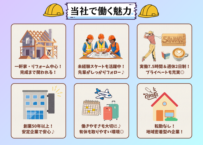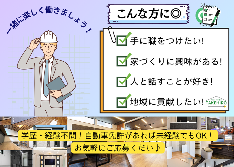 選考プロセス 新築・リフォームのご依頼増加に伴い、体制強化のため増員募集を行います。 今後は若手メンバーを中心に、さらに活気ある職場づくりを目指しています。 未経験の方はイチから丁寧にサポートしますのでご安心ください。 経験者の方は、これまでのスキルを活かし即戦力として活躍できる環境です。 ぜひ私たちと一緒に働きましょう! 【選考フロー】 書類選考 → 最終面接 → 内定
