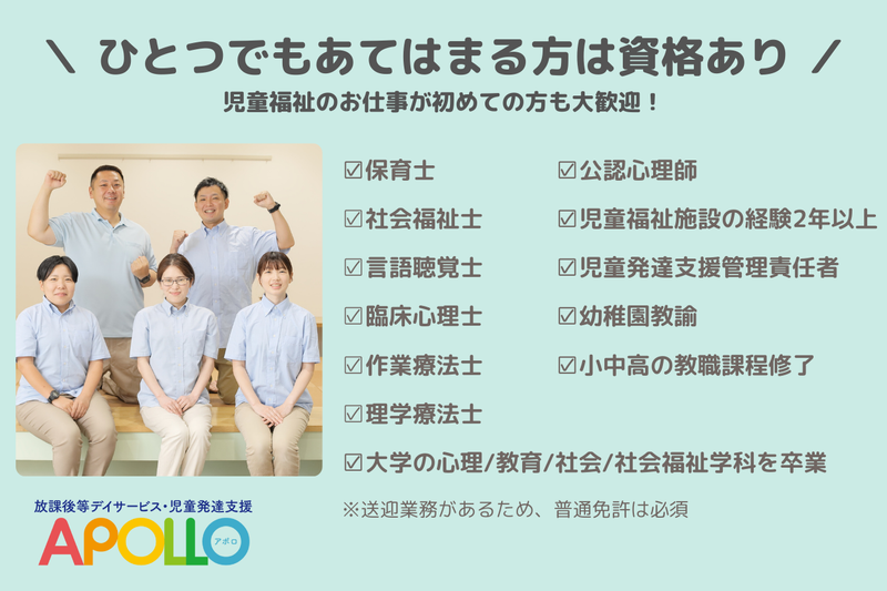 仕事内容 ✨月給23万円以上 ✨17時退社も可能 ✨持ち帰り仕事&残業なし ✅仕事内容 ・お子さまの日常生活や学習の支援 ・療育プログラムの提供や記録業務 ・レクリエーション活動の企画・実施 ・普通AT車での送迎 ✅アポロってどんなところ? 発達にメリハリのある、幼児/小中学生/高校生を対象とした児童福祉施設。 1日10名程度の少人数体制で、1人1人に寄り添い、生活や学習のサポートを行います。