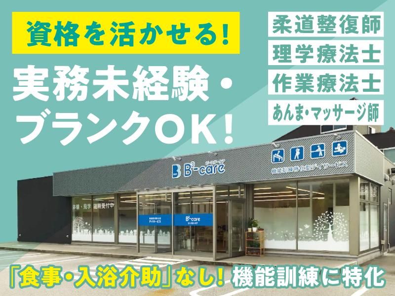 求めている人材 ◆経験 不問! 未経験者大歓迎! ◆資格 柔道整復師、理学療法士、作業療法士、あんま・マッサージ師 いずれかの資格をお持ちの方(その他物療専門職、看護師、准看護師) 「資格を持っているけど、資格を活かせてない」や「資格を活かした仕事に就きたい」と考えている方にもおすすめですよ♪ 固定シフトで残業がほぼないので「子供がいるから家庭とも両立したい」そんな考えをお持ちの方にもおススメです! 夜勤なし!食事・入浴介助なし! デイケアセンターB3-careは、機能訓練に特化した半日型デイサービスです。 「Body・Balance・Beauty」の理念のもと、心と身体の調和を大切にしながら、 ご利用者様が自分らしく、豊かに暮らす力を引き出す支援を行っています。 当事業所では、機能訓練の一環としてマッサージ療法を実施しており、 「身体が楽になった」「痛みが減った」「動きやすくなった」といったお言葉を多数頂戴しており、ご好評をいただいております。 その技術は、40年以上の臨床経験を持つ柔道整復師から直接学べる環境があるからこそ。 未経験の方でも、丁寧な研修と実践を通して、確かな技術と自信が身につきます。 スタッフ同士の対話やふりかえりも大切にしており、 「人の役に立ちたい」「成長したい」という気持ちを、しっかり支える職場です。 スタッフの得意を活かしながら、互いに育ち合える職場です。 教えるのが得意な人も、支えるのが得意な人も、それぞれの力を発揮できます。 未経験でも、あなたの“やってみたい”を大切にします。経験よりも、想いと姿勢を重視しています。 あなたの力が、誰かの笑顔につながる。そんな日々を、ここで一緒に築いていきませんか? <こんな方、大歓迎です!> ・ご利用者様が安全かつ快適に過ごしていただけるよう、細やかな気配りができる方 ・お年寄りと接することや話をすることが好きな方 ・学ぶ意欲、向上心のある方