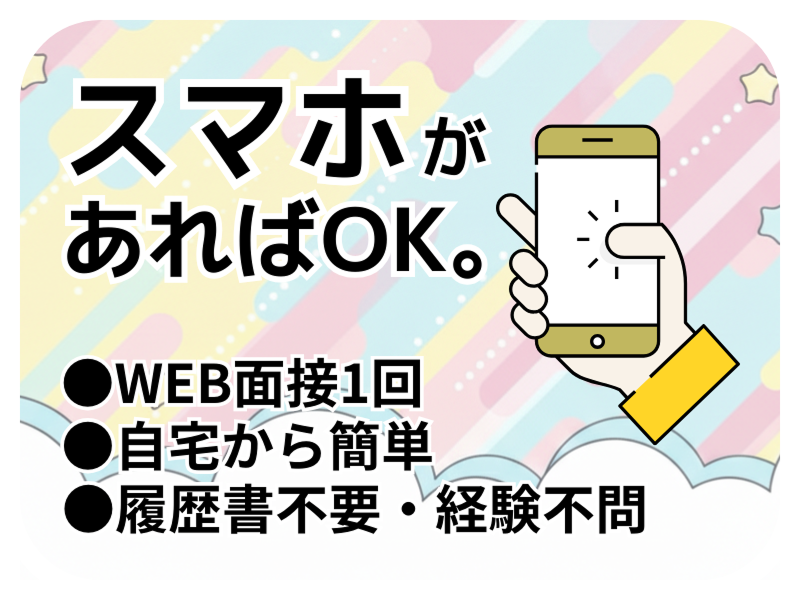 求める人材: 【20・30代の男女スタッフ活躍中!】 未経験OK!経験不問!スキル要らず! 研修制度が充実しているから 不安を感じることなくスタートできる! 「どんな仕事だろう?」 「詳しく聞いてみたい」 だけでも応募OKです◎ 履歴書なしでカンタン応募できます! お気軽にお問い合わせください!