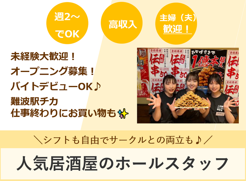 仕事内容 ☆.。.:・゜+.☆.。.:・゜+.☆.。.:*・゜+.☆ \話題沸騰中のため第2オープニングスタッフ大募集!/ みんなで一緒にスタートしよう! なんば駅スグの超人気居酒屋で、ホールまたはキッチンのお仕事をお任せします♪ ⌒⌒⌒⌒ アピールポイントてんこ盛り ⌒⌒⌒⌒ ✅ あなたらしく働けるシフトが自慢! 週2日~、1日3時間~勤務OKだから、学校やサークル、推し活とも両立カンペキ! 「テスト期間はちょこっと」「長期休みはガッツリ稼ぎたい!」 ──そんなワガママも遠慮なく相談しちゃってOK! 「仕込みだけお手伝い」「終電までには上がりたい!」もモチロンOK! シフト融通バツグンだよ。 ✅ 高時給でやる気もアップ! 週5日かつ1日5時間以上なら時給1300円も叶っちゃう?! しっかり稼ぎたいフリーターさんも大歓迎! ✅ 駅チカで超便利! 雨の日も学校帰りも楽ちん通勤! バイト前後にショッピングや友達とご飯も行けちゃう最高のロケーション! ✅ SNSで話題になるかも?!オシャレ店内で働けるチャンス! カワイイ制服もあるかも…?! 系列店もいっぱいあるから、希望も聞かせてね。 。:+* 具体的なお仕事はコチラ *+:。 お客様のご案内、オーダー取り(ハンディ操作もスグ覚えられる!)、 美味しい料理やドリンク運び、テーブルの片付けなど! 最初はカンタンなことから丁寧に教えるから、バイト初めてサンも全然心配いりません! 優しい先輩たちがしっかりサポートします。 「オシャレなとこで働きたい!」「同年代の仲間と楽しくやりたい!」 「なんか面白そう!」…動機は何でもOK! 一緒にお店を盛り上げてくれる仲間、大募集中です! ※系列店舗沢山あります! 梅田エリアをお探しの方は是非!!! ・新時代 梅田店 ・新時代 梅田二号店 募集中♪