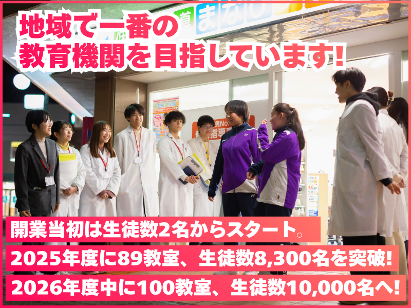 職場環境 / 2026年2~3月にも 9教室を新規開校! \ 開業当初、 生徒数2名からスタート ▼ 2025年に89教室、 生徒数7,800名を突破! ▼ 2026年度中に100教室、 生徒数10,000名を 目指しています! 喫煙所:なし(敷地内全て禁煙)