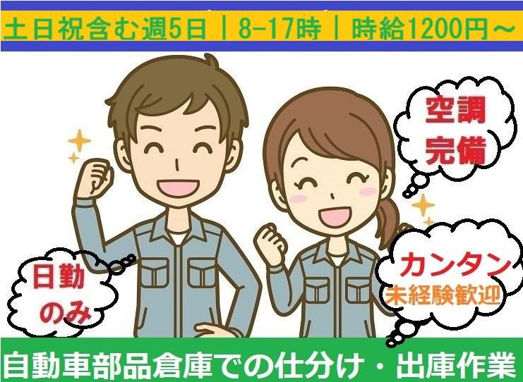 仕事内容 土日祝含む、週5日の日勤募集⭐ 空調完備の倉庫内での軽作業! \部品の仕分け&出荷作業/ ✅カンタン&人気の倉庫内軽作業! ✅長期安定!大手メーカーのお仕事! ✅日勤のみ!時給1200円~!! ✅エアコン完備の快適な職場 ✅簡単コツコツ作業で未経験も安心 <面接交通費としてギフト券1000円支給> ================== 大手自動車メーカーの部品センターに 入庫してきた部品の仕分けと出荷作業 をお任せします! 決められた作業をコツコツと 確実にこなせる方なら 特別な経験や資格は一切不問! カンタン作業ばかりなので 倉庫内作業が初めての方も ご安心ください!