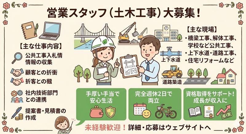 【アピールポイント】 【土木会社での営業スタッフを募集!】 ==無理なく働ける安心の環境== ✅️完全週休2日制 ✅️資格取得支援制度あり ✅家族手当や資格手当など福利厚生充実!