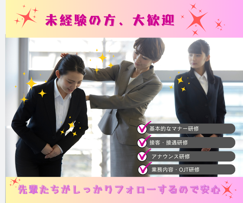 求める人材: \20~30代女性活躍中/ ◆未経験の方、大歓迎! ◆受付・レセプションなどの経験がある方、直ぐに活躍できます! ≪こんな方にピッタリ≫ ■接客がスキな方 ■人の役に立つ仕事がしたい方 ■接客マナーを身につけたい方 ■PCを使った事務業務も抵抗ない方 ■長期的に働ける環境を探している方