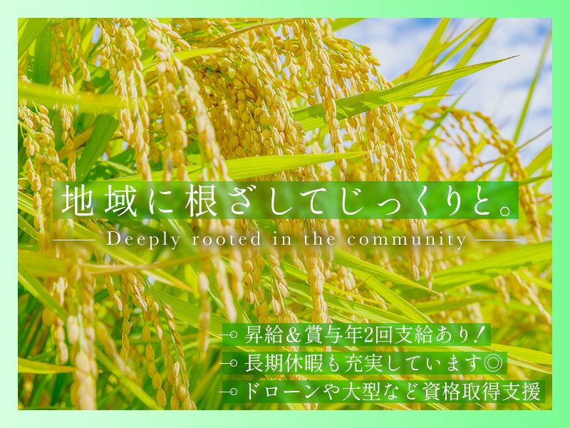 仕事内容 〇●‥‥‥‥‥‥‥‥‥‥‥‥ 自然と向き合いながら 未経験から成長できる! ‥‥‥‥‥‥‥‥‥‥‥‥●〇 ↓↓求人のPOINTを要チェック↓↓ ✅昇給&賞与年2回支給あり! ✅長期休暇も充実しています ✅ドローンや大型特殊免許の取得支援 ✅サマータイムの導入あり ✅残業少なめ&職場見学OK! ✅機械化・ICT導入済み …まだまだ魅力は尽きません! ↓↓ 気になる方はこの先をCHECK ↓↓ 【 仕事内容はコチラ 】 お米を作っている農場です。 水稲栽培作業全般をおまかせします! ▽仕事内容 ・機械操作 ・栽培管理 ・圃場整備など ドローンの積極活用をはじめ、 IT技術の導入で効率も高いです! 行政と連携した栽培技術の研究なども 積極的に行っています。 【 ゼロから成長しよう! 】 教育体制が充実しているため、 初めての方も安心して働けます。 わからないことはなんでも相談OK!
