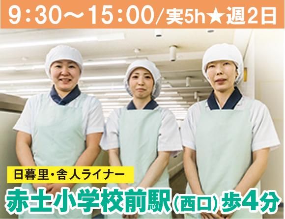 仕事内容 \働く方に楽しい食事を/ 安心の大手企業内/社員専用食堂♪ 【勤務地】 日暮里・舎人ライナー 「赤土小学校前駅」西口徒歩4分 京成本線 「新三河島駅」より徒歩7分 (東京都北区田端新町2丁目) ♥調理補助スタッフさん! 未経験者大歓迎♪親切指導で安心♪ 20~63歳!主婦・女性活躍中! 【具体的には】 ・昼食等の調理補助 ・盛付け、提供 ・簡単な食器類の洗浄など 【勤務時間・曜日】 9:30~15:00/実5h・休0.5h ★月~金曜内で週2日 (曜日については応相談) ♥ゆとりの勤務も大人気! 【休日・休暇】 土・日・祝日・GW・年末年始 他、企業カレンダーによる休み有! ★年間休日120日以上でオフも充実♪ (お子様のいらっしゃる方にも大好評) 【社員食堂で働くメリット】 ✅働き易く安定した勤務時間♪ 社員食堂は企業の営業時間等に合わせて運営されており、中でも平日のランチタイムが中心です♪ ✅お客様は常連(社員やスタッフさん等) 社員食堂のお客様はその企業で働く社員やスタッフさん等がほとんどなので、とてもアットホームな環境です♪笑顔いっぱいの「美味しかったよ~」「ごちそうさま」も大きなやりがいです ✅嬉しい食事補助(美味しい賄いあり) 昼食代の節約&お弁当の手間も不要♪ ✅ご家庭での調理にも役立つスキル♪ 調理方法や衛生管理の知識もゲット! ✅他、飲食業等とは異なる休日♪ 各企業等の休日と合わせる社員食堂がほとんどなので、土・日・祝日やGW・年末年始休暇があるのも人気の理由。 【当社概要】 ・企業事業所給食/首都圏約200店舗 ・ISO14001取得
