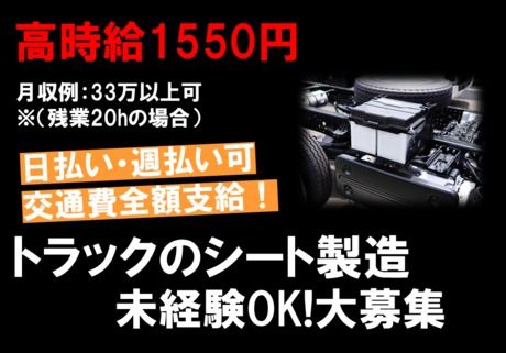 仕事内容 シンプル&繰り返し作業だから未経験でも安心。 20~50代の男女が活躍中の安定職場です。 《モクモク作業が好きな方にピッタリ!》 トラックに取り付ける シート(カバー)部分の組立作業を担当します ★魅力ポイント  ̄V ̄ ̄ ̄ ̄ ̄ ̄ ̄ ̄ ̄ ・未経験でも時給1550円の高収入 ・夜勤・残業手当で 月32万円以上も可 ・交通費全額支給 ・日払いOK ・社会保険完備 ・有給休暇あり ・ロッカー・休憩室あり ・WEB面談OK ・20~50代の男女が幅広く活躍中 ・・・・・・・・・・・・・・・・・・・・ ▼具体的な作業内容▼ ・フレーム(骨組)に シートカバーを被せる ・手で引っ張りながら シワ、たるみを微調整 ・カバーが規定位置に 収まっているか目視でチェック ・完成品をラックへ持ち上げて移動 (重すぎる物はなく、男女ともに活躍中♪) ※ラインに沿って “同じ作業を繰り返す”スタイル ※専門スキル不要 ※丁寧な研修あり 未経験でもすぐ慣れます ・・・・・・・・・・・・・・・・・・・・ ★こんな方におすすめ  ̄V ̄ ̄ ̄ ̄ ̄ ̄ ̄ ̄ ̄ ◇未経験からできる 工場ワークを探している ◇モクモク/コツコツ作業が好き ◇交替勤務でしっかり稼ぎたい ◇身体を動かす仕事がしたい ◇製造・軽作業の経験を活かしたい ================== 「安定して稼ぎたい」 「未経験から始められる工場ワークがいい」 そんな方にぴったり。 まずは“応募前の質問だけ”でもOKです!