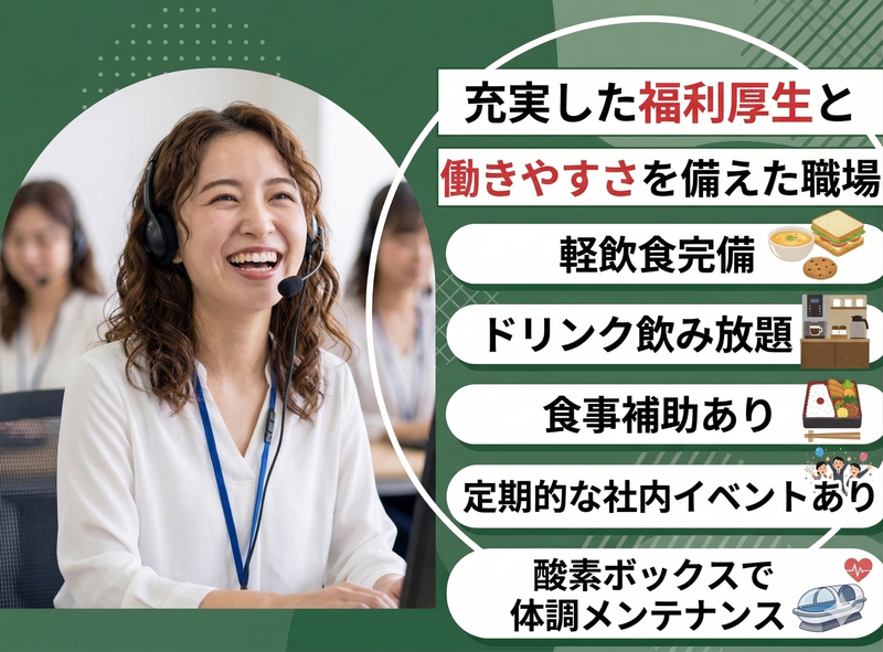 仕事内容 ━━━━━━━━━━━━━━━━━━━━ 問い合わせ対応を行う コールセンタースタッフを募集! ━━━━━━━━━━━━━━━━━━━━ ─┘─┘─┘─┘─┘─┘─┘─┘─┘ ▼働きやすい理由&魅力▼ ✅ノルマなし! ✅残業ゼロ&完全土日祝休みでプライベート充実 ✅服装・髪色・ネイル・ピアス全部自由! ✅食事補助「チケットレストラン」あり ✅未経験でも安心のトークマニュアル完備 ─┘─┘─┘─┘─┘─┘─┘─┘─┘ ≪業務内容≫ 通信販売をご利用のお客様からの、 お電話やメールでのお問い合わせに 対応するお仕事です。 扱う商品は、健康食品や化粧品が中心。 丁寧なマニュアル完備なので、 未経験の方も安心してスタートできます。 ↓↓ ▼ ↓↓ 具体的なお仕事 ↓↓ ▼ ・商品のご注文受付、データ入力 ・「いつ届きますか?」などの納期に関する質問対応 ・定期コースの内容変更手続き ・商品の使い方に関するご案内 ・お客様情報の更新作業 >>>経験ゼロでもこれで安心 1|入社後10日間は丁寧な研修から (商品知識や電話の受け方など 基本からしっかり学べます) ※研修期間は時給1,100円 ※コールデビューから時給1,300円へ切り替え 2|誰でも話せるトークマニュアル完備 (読み上げるだけでOKなので簡単!) 3|困った時は先輩がすぐフォロー (すぐ隣に先輩がいるので、 いつでも質問できる環境です) 4|簡単な問い合わせからスタート (慣れるまでは簡単な内容から お任せするのでご安心ください) ⇒結果、未経験スタートの先輩がほとんどです! 【この環境で働く魅力など】 01.│「ノルマなしで、のびのび働ける」 →厳しいノルマはありません。 自分のペースで落ち着いて お客様対応に集中できます。 02.│「ユニークな福利厚生で毎日がお得に」 →毎月7,000円分の食事補助 (チケットレストラン)や、 リフレッシュに最適な酸素ボックスも 使い放題です! 軽飲食も完備!ドリンク飲み放題! 03.│「キャリアアップも目指せる環境」 →アルバイトから正社員になった 実績も多数あります。 あなたの頑張りをしっかり評価し、 キャリアを応援します。 <✨他にはない、ここで働く魅力✨> →残業は一切ありません。 18時には全員が「お疲れ様でした!」と 退社しているので、プライベートも 大切にしながら働けます。 \スタッフにインタビューしてみました!/  ̄ ̄ ̄v ̄ ̄ ̄ ̄ ̄ ̄ ̄ ̄ ̄ ̄ ̄ ̄ ̄ ̄ ■入社のきっかけ… コールセンターは未経験でしたが、 「駅チカ」「ノルマなし」と「土日祝休み」に 惹かれて応募しました。 研修が丁寧だったので 安心して始められました。 ■仕事のやりがいについて… お客様から直接「ありがとう」と 言っていただけた時に やりがいを感じます。