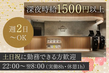 仕事内容 ★夜勤フロント募集★ホテルのお仕事が初めての方も歓迎! ゲストサービススタッフとして、 チェックインなどのレセプション業務、 ご案内・各種手配を行う コンシェルジュ業務をお任せします♪ 【具体的には】 □:チェックイン・チェックアウト □:翌日の予約確認・清掃指示書作成 □:電話対応・メール返信 □:朝食対応(退勤前の1時間のみ) □:共用部の清掃 など 【夜勤シフトの魅力】 比較的落ち着いた環境で 接客や業務に集中できるところも魅力の1つ。 一人ひとりのお客様にじっくりと 焦らず対応を進めることができます。 お客様からの「ありがとう」を励みに、 働きながら自分自身も成長できますよ! ◆22:00~翌8:00で募集/夜勤シフト 22:00~翌8:00で週2日の勤務でOK! 休憩は2時間しっかりとれます★ 「授業のない日や土日祝メインで」 「レギュラー勤務で収入を安定させたい」 「効率良くしっかり稼ぎたい」など、 さまざまな希望に合う働き方が可能です。 勤務時間や曜日、日数などは ライフスタイルに合わせて相談できますので、 安心してムリなく働いていただけますよ◎ ~ 街と人がつながるスクエア ~ ザ・スクエアホテルのコンセプトは、 観光で訪れた人と 地域の人々がおなじ空間と時間を 共有できる「街のスクエア」。 その名のとおり、ホテルロビーと それに続くカフェレストランは 観光のお客様と地元のお洒落なお客様で いつも賑わっています。 海外からのお客様も多く、 英語を活用したい方にもピッタリです♪ ◆未経験からのチャレンジも応援します! 特別な採用条件は一切無し! 接客経験がない方も大丈夫です。 勤務開始前にオリエンテーションを行い、 実務に入ってからも先輩スタッフが 丁寧なOJTでサポートするので安心◎ 未経験から、ホテルならではの 高いコミュニケーションスキルや、 マナー・言葉遣いなどが身に付きます。 現在は、フリーターや主婦(夫)さん、 学生さんなど幅広い世代が活躍中! 第二新卒やキャリアチェンジを 図りたい方も大歓迎です◎ < ソラーレ ホテルズ アンド リゾーツについて > ソラーレ ホテルズ アンド リゾーツは、 積極的に全国にホテルを展開しています。 お客様が求めるニーズに合ったホテルで、 最適なサービスを提供できるよう、 多数のホテルブランドを保有しています。 優秀なスタッフを育成するため、 社内認定トレーナー資格制度や 教育訓練に注力しています。