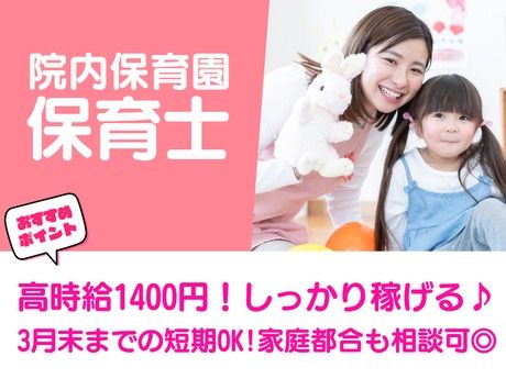 仕事内容 \ここがポイント/ ★高時給1400円!しっかり稼げる保育士♪ ★未満児のみ×少人数の院内保育園 ★3月末までの短期も相談OK! *・。・。*・。・。*・。・。* <仕事内容> \0~2歳児を対象とした保育業務/ 定員30名ほどの小規模な院内保育園で、 子どもたち一人ひとりに寄り添えます♪ ▼主なお仕事内容 ・食事や排泄、午睡などの生活介助 ・室内外での遊びの見守り ・製作物の作成や記録業務 ・園舎や園庭の清掃 など ※担任業務ではありません ※3月末までの短期勤務もOK ▼おすすめポイント! ★高時給1400円で短期でもしっかり収入確保 ★追加人員の補充なので休み相談も柔軟 ★お子様の急な体調不良にも理解ある環境◎ ▼こんな方にピッタリ! ・子育てと両立して働きたい方 ・ブランクから復帰したい方 ・次のお仕事までの“つなぎ”を探している方 ★マルルスタッフも多数活躍中! 初めての職場でも安心してスタート可能です♪ 少人数で家庭的な雰囲気の保育園です。 まずはお気軽にご応募ください♪ *・。・。*・。・。*・。・。*