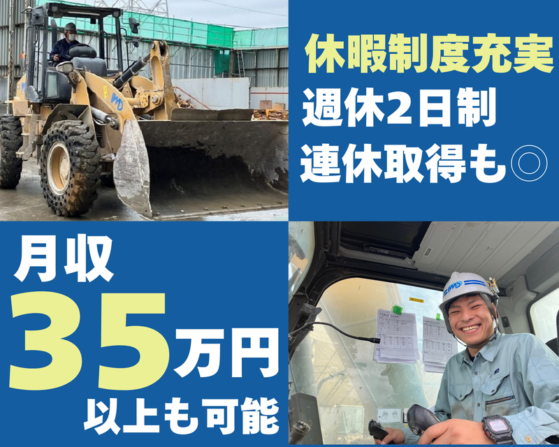 仕事内容 ━━━━━━━━━━━━━━━━━ << 求人のPOINT >> ✅正社員/重機オペレーター大募集! ✅工場内でのコツコツ作業! ✅高収入を実現!月収35万円以上も可能 ✅賞与年2回+各種手当などを豊富にご用意 ✅年間休日110日と業界では多め! ✅休暇も取りやすく働きやすい職場! 夏季・年末年始それぞれ(6~8日) &育児休暇・介護休暇などもあり! ━━━━━━━━━━━━━━━━━ 【仕事内容】 産業廃棄物処理工場内での 廃棄物の選別・移動・積込作業など。 作業は、油圧ショベル等の重機を使用したコツコツ業務が中心です。 ◆使用する重機の種類 ユンボ・パワーショベル・バックホウなど - 【 職場の雰囲気 】 30代~50代スタッフ活躍中! チームワークを大切に周りとコミュニケーションをとって働ける方は大歓迎! 「仕事も遊びも家庭も今より充実させたい」 そんな思いを持って転職してきたスタッフが元気に活躍しています! 急なご家族の体調不良等でのお休みや、 育児休暇・介護休暇もございますので、 「家族との時間を大切にしたい!」 という方にとっては、 特に安心して働ける環境だと思います! - 【キャリアアップ】 頑張り次第で随時昇給やキャリアアップも可能です! やがては会社の幹部候補として成長していっていただけると嬉しいです! ー 【“ IWD”について 】 ✅事業内容 建設現場などから出る「産業廃棄物」を、 集める → 分別する → 再利用する → 最後まで責任を持って処理する! 環境にやさしい プロフェッショナル集団です! ✅どんなことをしてるの? 1. 集める(収集・運搬) 街の工事現場から出る廃材やゴミを、 専用トラックで安全に回収! ▼ 2. 分別する(中間処理) 回収したものを種類ごとに分けて、 リサイクルできるものを選別! ▼ 3. 再利用する(リサイクル) 使える資源は再び社会へ! 土木資材などの新たな資源に 生まれ変わります! ▼ 4. 最後まで責任を持つ(最終処分) どうしても再利用できないものは、 ルールに則って安全に処分! ✅IWDのここがスゴイ! ・創業30年以上の安定企業 ・廃棄物を資源に変換している! ・関東圏に複数拠点あり ・若手〜ベテランまで幅広く活躍中 ・地球にやさしい仕事で社会貢献! ✅ホームページURL https://iwd.co.jp/