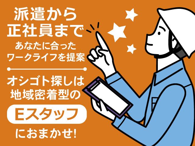 仕事内容 富山市で設備監視のお仕事! / 高時給・三交替で しっかり稼げるお仕事です! \ /////////////おすすめポイント///////////// 〇時給1,600円~1,700円! 〇経験や資格は問いません 〇週休2日制でプライベートも充実 〇直接雇用有で正社員を目指せます 〇若手から中高年まで活躍中! /////////////////////////////////////////////////// <主な業務内容> 工場内における生産設備の監視、 巡回、一部の設備切り替え作業です。 ・定期巡回 ・メーター確認 ・数値の記録 ・切り替え作業 業界未経験の方も歓迎! 接客が苦手という方や 人と話すことが苦手な方も モクモクと作業できる環境です。 未経験の方でもマニュアルに沿って 丁寧に指導いたします。 ※力仕事はありません。 - こんなお仕事がしたい! 月にこれくらい稼ぎたい! この時間帯・この曜日に働きたい! ハローワークでいいお仕事が見つからない! こんな方は是非、ご連絡ください。 ご相談だけでもOKです。 人材派遣のEスタッフは スタッフ一人ひとりに親身に寄り添う 地域密着型の派遣会社です。 ご不明点はお気軽にお問い合わせください。 WEBまたはお電話から簡単応募OK! 〇株式会社オレンジライン 人材開発事業部 Eスタッフ 〇富山県富山市黒瀬285 〇TEL/0120-112-155(採用担当まで)