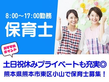仕事内容 \ここがポイント/ ★ 熊本県熊本市東区小山での保育士募集! ★ 土日祝休みで、プライベートも充実◎ ★ 週4日~勤務OK!ライフスタイルに合わせて働ける♪ *・。・。*・。・。*・。・。* <仕事内容> 0歳~5歳児の保育業務を担当し、子どもたちの成長をサポートするお仕事です。 安心して過ごせる環境を提供しながら、毎日の保育業務を行います。 - 保育計画に基づく日々の保育業務 - 子どもたちとの遊びや生活サポート - 保護者対応や連絡帳の記入 *・。・。*・。・。*・。・。*