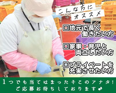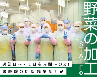 仕事内容 工場内での 野菜加工をお任せします! <具体的には..> ■野菜を洗う ■野菜の下ごしらえ(ヘタを取るなど) ■カットした野菜を機械に入れる など 「私にできるかな..」 「ブランクあるけど大丈夫かな..」 そんな不安がある方もご安心ください! 今いるスタッフの9割は 未経験からスタートしています♪ 優しい先輩スタッフが イチから丁寧にサポートします!