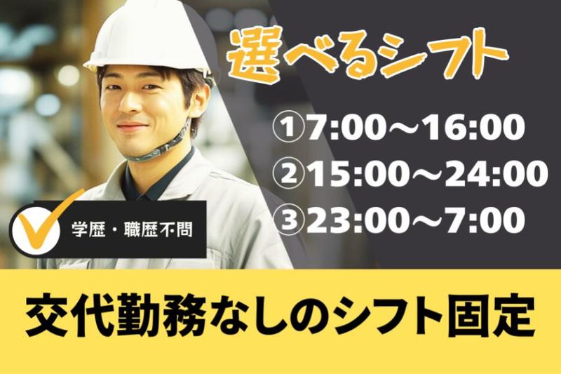 【勤務時間】 ① 1直 7:00~16:00(実働8H休憩1H) ② 2直 15:00~0:00(実働8H休憩1H) ③ 3直 23:00~7:00(実働8H休憩1H) ※直固定※交代勤務なし
