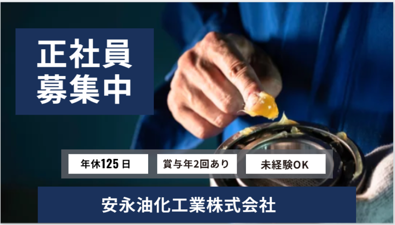 仕事内容 \\この求人のポイント//  ̄ ̄ ̄ ̄ ̄ ̄ ̄ ̄ ̄ ̄ ̄ ̄ ̄ ̄ ̄ ̄ ̄ ̄ ̄ ✅年間休日125日! 土日祝休みでプライベートも充実◎ ✅家庭的で明るい雰囲気の職場で イキイキと働ける♪ ✅昇給・賞与年2回あり! 安定して長く働ける環境が整っています! <仕事内容>  ̄ ̄V ̄ ̄ ̄ ̄ ̄ ̄ ̄ ̄ ̄ ̄ ̄ ̄ ̄ ̄ ̄ ̄ ̄ 工業用潤滑剤(グリース)の小詰め分け 充填作業を担当していただきます。 <具体的な仕事内容>  ̄ ̄V ̄ ̄ ̄ ̄ ̄ ̄ ̄ ̄ ̄ ̄ ̄ ̄ ̄ ̄ ̄ ̄ ̄ ・グリースの充填作業 ・ドラム缶の取り扱い ・充填機の操作 など 未経験からスタートOK! 先輩社員が丁寧に指導しますので、 安心して仕事に取り組むことができます。 機械操作や製品の取り扱いなど、 ものづくりの現場でスキルを身につけながら 成長できる環境です! ◤ ̄ ̄ ̄ ̄ ̄ ̄ ̄ ̄ ̄ ̄ ̄ ̄ ̄ ̄ ̄ 安永油化工業株式会社について ________________◢ 当社は、グリースと呼ばれる 産業用潤滑油の専門会社として 長年にわたり事業を展開してきました。 オンとオフの切り替えを大切にしており 年間休日125日に加えて、 年5日以上の有給休暇取得を奨励。 家庭的で明るい雰囲気のなか、 従業員一人ひとりがイキイキと活躍できる 職場づくりを心がけています。 長期的に安定して働ける環境が 整っていますので、腰を据えて 活躍したい方にぴったりの職場です。 この度、 次の世代を担う人材を募集中です。 皆様のご応募お待ちしております!