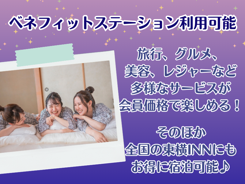 【保険制度】 雇用保険、労災保険、健康保険、厚生年金 待遇・福利厚生 【福利厚生】 *昇給あり *ミニボーナスあり *交通費支給(月上限5万円まで) *22時~翌5時までは時給25%UP! \頑張った分だけインセンティブも/ 『稼働率手当』『繁忙期特別手当』あり *社会保険完備 *制服貸与 *有給休暇(半年以降付与) *宿泊割引 └全国の東横イン本人30%・家族知人20%割引 *従業員割引/ベネフィット・ステーション └弊社と提携している会員制で、 お得な待遇が受けられるサービス。 約14000施設の宿泊施設に 会員価格でお得に利用ができたり、 その他にも・・・ ✅スポーツクラブ ✅介護・育児 ✅健康管理 ✅研修講座 ✅エンターテイメント ✅物販 etc 6000以上の様々なライフサービスを 揃えています。 これらすべてのメニューを 会員特別価格で 利用することができるサービスです。